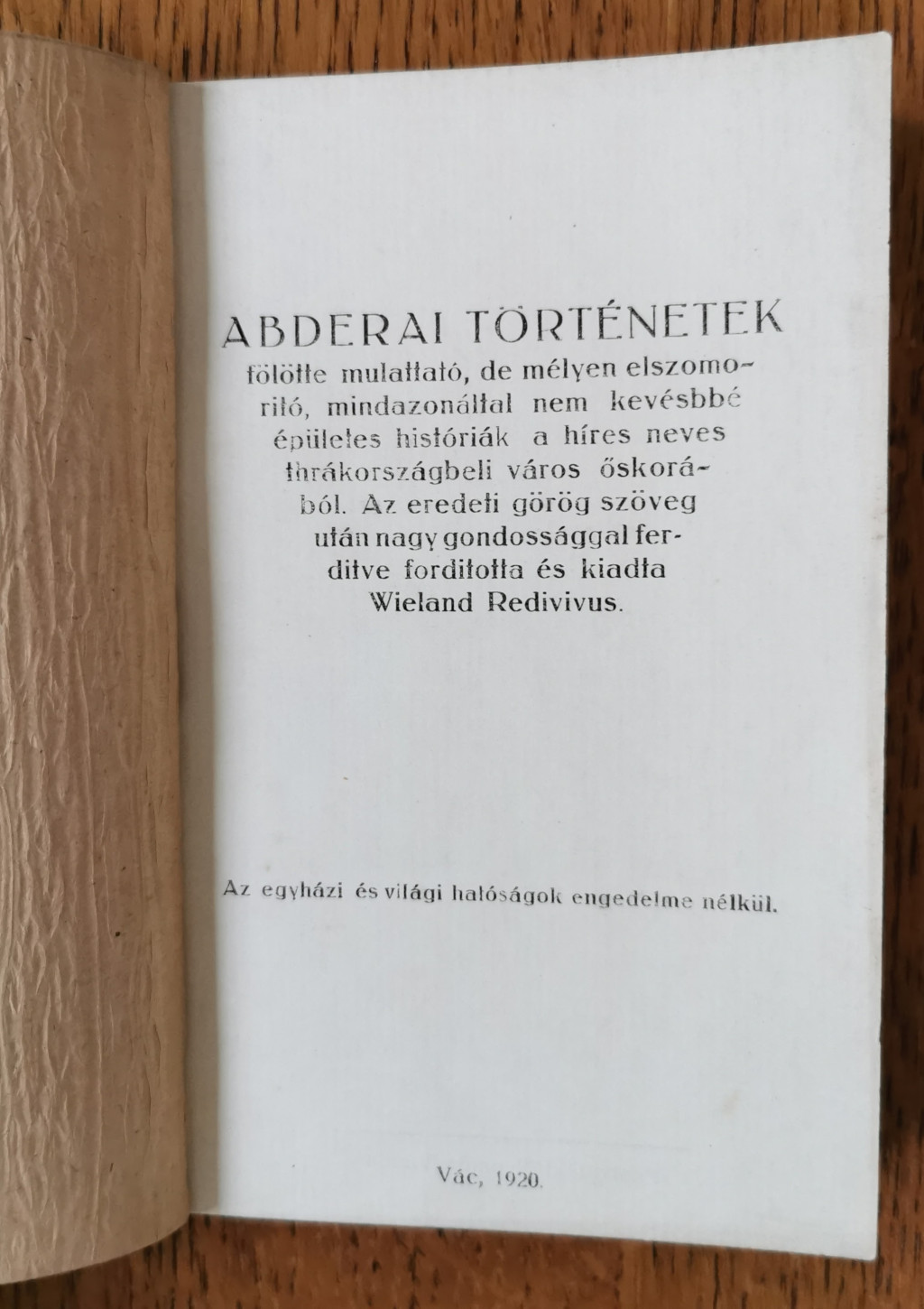 Az eredeti görög szöveg után nagy gondossággal ferdítve forditotta és kiadta Wieland Redivivus.Vác, 1920. Pestvidéki Nyomda. 47+(1) p. Egyetlen kiadás! Dedikált! „Móric Pali nagyon kedves barátomnak szeretettel Vác 1921 8/8 Tragor Náci”