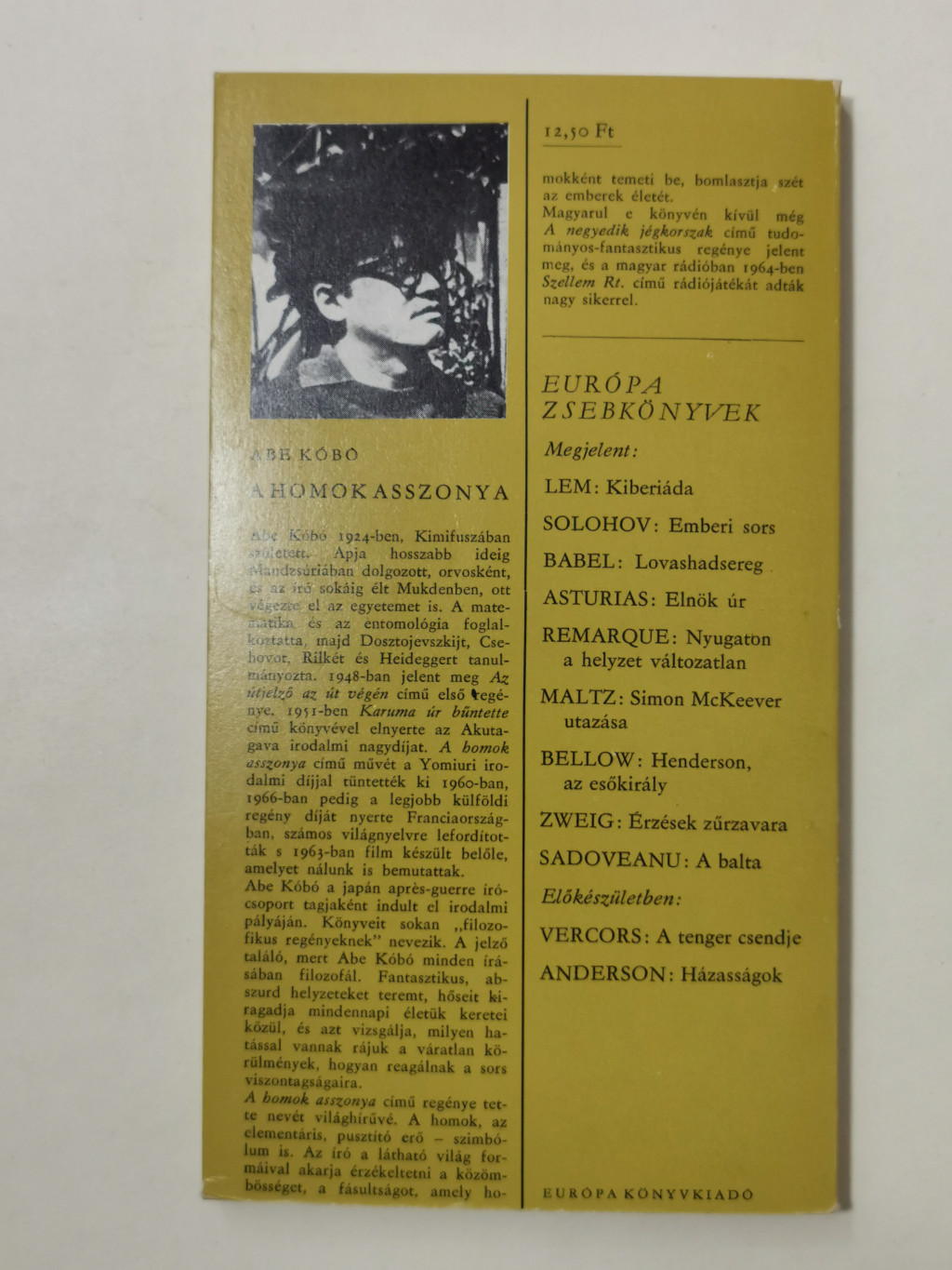 Abe Kóbó 1924-ben, Kimifuszában született. Apja hosszabb ideig Mandzsúriában dolgozott, orvosként, és az író sokáig élt Mukdenben, ott végezte el az egyetemet is. A matematika és az entomológia foglalkoztatta, majd Dosztojevszkijt, Csehovot, Rilkét és Heideggert tanulmányozta. 1948-ban jelent meg Az útjelző az út végén című első regénye. 1951-ben Karuma úr bűntette című könyvével elnyerte az Akutagava irodalmi nagydíjat. A homok asszonya című művét a Yomiuri irodalmi díjjal tüntették ki 1960-ban, 1966-ban pedig a legjobb külföldi regény díját nyerte Franciaországban, számos világnyelvre lefordították s 1965-ben film készült belőle, amelyet nálunk is bemutattak. Abe Kóbó a japán aprés-guerre írócsoport tagjaként indult el irodalmi pályáján. Könyveit sokan “filozofikus regényeknek" nevezik. A jelző találó, mert Abe Kóbó minden írásában filozofál. Fantasztikus, abszurd helyzeteket teremt, hőseit kiragadja mindennapi életük keretei közül, és azt vizsgálja, milyen hatással vannak rájuk a váratlan körülmények, hogyan reagálnak a sors viszontagságaira. A homok asszonya című regénye tette nevét világhírűvé. A homok, az elementáris, pusztító erő - szimbólum is. Az író a látható világ formáival akarja érzékeltetni a közömbösséget, a fásultságot, amely homokként temeti be, bomlasztja szét az emberek életét. Magyarul e könyvén kívül még A negyedik jégkorszak című tudományosfantasztikus regénye jelent meg, és a magyar rádióban 1964-ben Szellem Rt. című rádiójátékát adták nagy sikerrel.