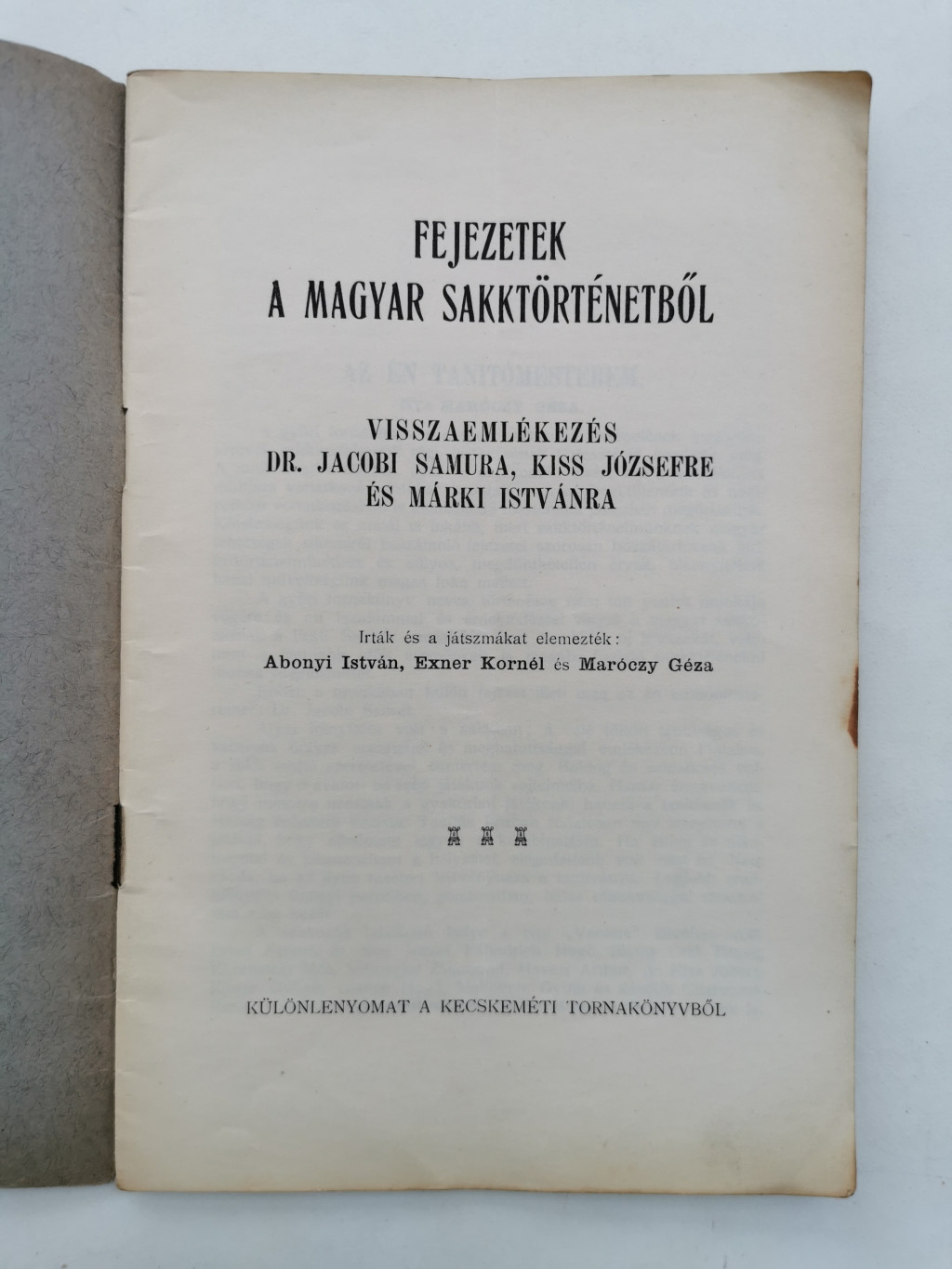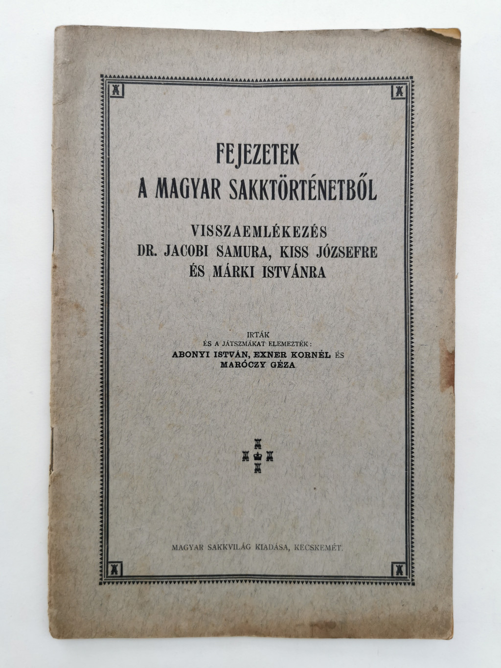 Visszaemlékezés Dr.Jacobi Samura, Kiss Józsefre és Márki Istvánra. Írták és a játszmákat elemezték - - Kecskemét, é.n. Magyar Sakkvilág. 24 p. Fűzve.
