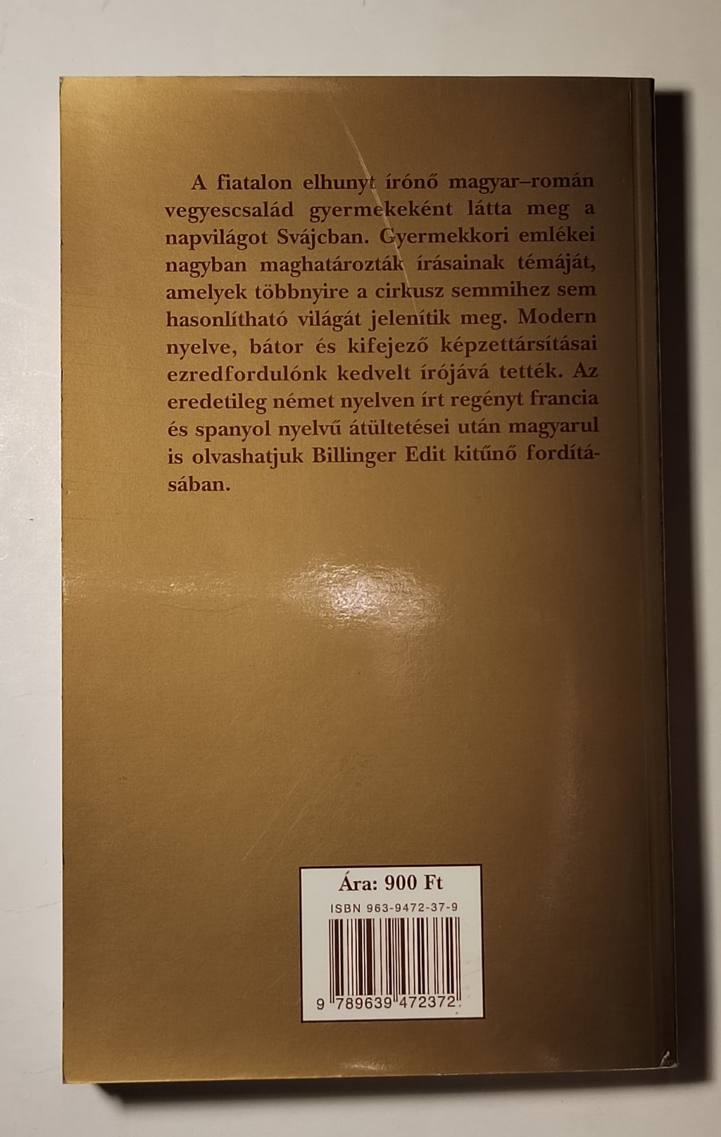 A fiatalon elhunyt írónő magyar-román vegyescsalád gyermekeként látta meg a napvilágot Svájcban. Gyermekkori emlékei nagyban meghatározták írásainak témáját, amelyek többnyire a cirkusz semmihez sem hasonlítható világát jelenítik meg. Modern nyelve, bátor és kifejező képzettársításai ezredfordulónk kedvelt írójává tették. Az eredetileg német nyelven írt regényt francia és spanyol nyelvű átültetései után magyarul is olvashatjuk Billinger Edit kitűnő fordításában.