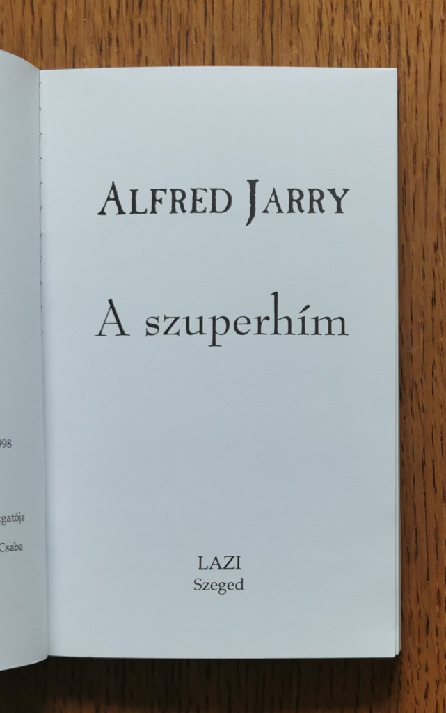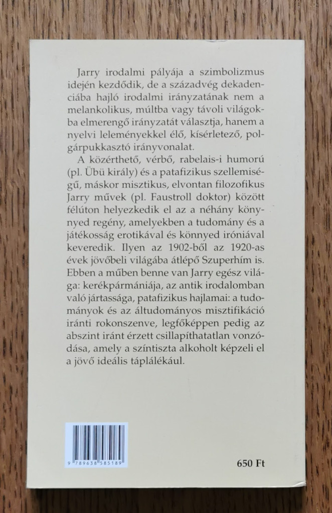 A közérthető, vérbő, rabelais-i humorú (pl. Übü király) és a patafizikus szellemiségű, máskor misztikus, elvontan filozofikus Jarry művek (pl. Faustroll doktor) között félúton helyezkedik el az a néhány könnyed regény, amelyekben a tudomány és a játékosság erotikával és könnyed iróniával keveredik. Ilyen az 1902-ből az 1920-as évek jövőbeli világába átlépő Szuperhím is. Ebben a műben benne van Jarry egész világa: kerékpármániája, az antik irodalomban való jártassága, patafizikus hajlamai: a tudományok és az áltudományos misztifikáció iránti rokonszenve, legfőképpen pedig az abszint iránt érzett csillapíthatatlan vonzódása, amely a színtiszta alkoholt képzeli el a jövő ideális táplálékául.