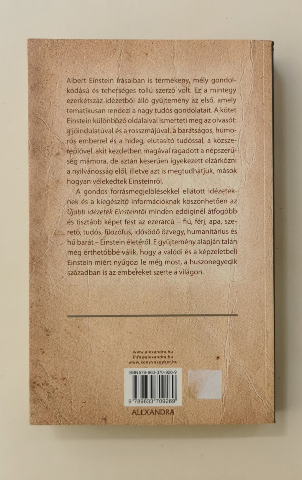 Albert Einstein írásaiban is termékeny, gyakran mély gondolkodású és tehetséges tollú szerző volt. Ez a mintegy ezerkétszáz idézetből álló gyűjtemény az első, amely tematikusan rendezi a nagy tudós gondolatait. A kötet Einstein számos oldalával megismerteti az olvasót: a jóindulatúval és a rosszmájúval, a meleg, humoros emberrel és a hideg, elutasító tudóssal, a közszereplővel, akit kezdetben magával ragadott a népszerűség mámora, de aztán keserűen igyekezett elzárkózni a nyilvánosság elől, illetve azt is megtudhatjuk belőle, mások hogyan vélekedtek Einsteinről. A gondos forrásmegjelölésekkel ellátott idézeteknek és a kiegészítő információknak köszönhetően az Újabb idézetek Einsteintől minden eddiginél átfogóbb és tisztább képet fest az ezerarcú – fiú, férj, apa, szerető, tudós, filozófus, idősödő özvegy, humanitárius és hű barát – Einstein életéről. E gyűjtemény alapján talán még érthetőbbé válik, hogy a valódi és a képzeletbeli Einstein miért nyűgözi le még most, a huszonegyedik században is az embereket szerte a világon.