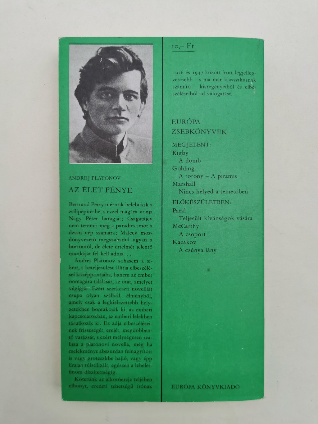 Bertrand Perry mérnök belebukik a zsilipépítésbe, s ezzel magára vonja Nagy Péter haragját ; Csagatájev nem teremti meg a paradicsomot a dzsan nép számára; Malcev mozdonyvezető megszabadul ugyan a börtöntől, de élete értelmét jelentő munkáját fel kell adnia… Andrej Platonov sohasem a sikert, a beteljesülést állítja elbeszélései középpontjába, hanem az ember önmagára találását, az utat, amelyet végigjár. Ezért szerkeszti novelláit csupa olyan szálból, élményből, amely csak a legkiélezettebb helyzetekben bontakozik ki, az emberi kapcsolatokban, az emberi lélekben tárulkozik ki. Ez adja elbeszéléseinek frissességét, erejét, megdöbbentő varázsát, s ezért mélységesen realista a platonovi novella, még ha cselekménye abszurdan felnagyított is vagy groteszkbe hajló, vagy épp líraian túlstilizált, egészen a leheletfinom díszítettségit. Kötetünk az alkotóereje teljében elhunyt, eredeti tehetségű írónak 1926 és 1947 között írott legjellegzetesebb – s ma már klasszikusnak számító – kisregényeiből és elbeszéléseiből ad válogatást.