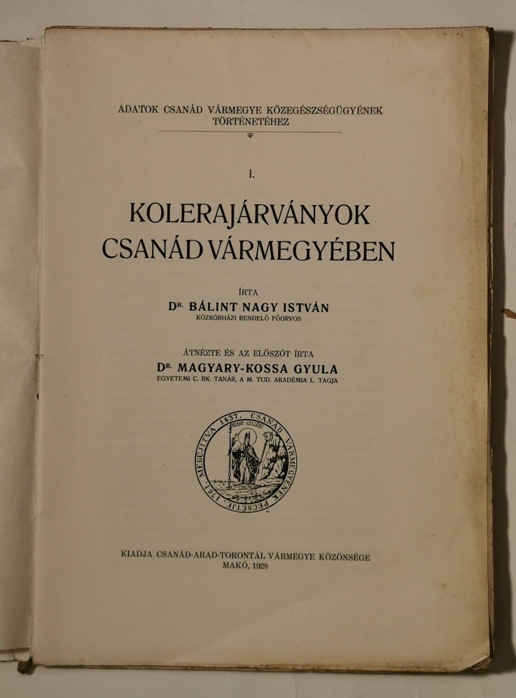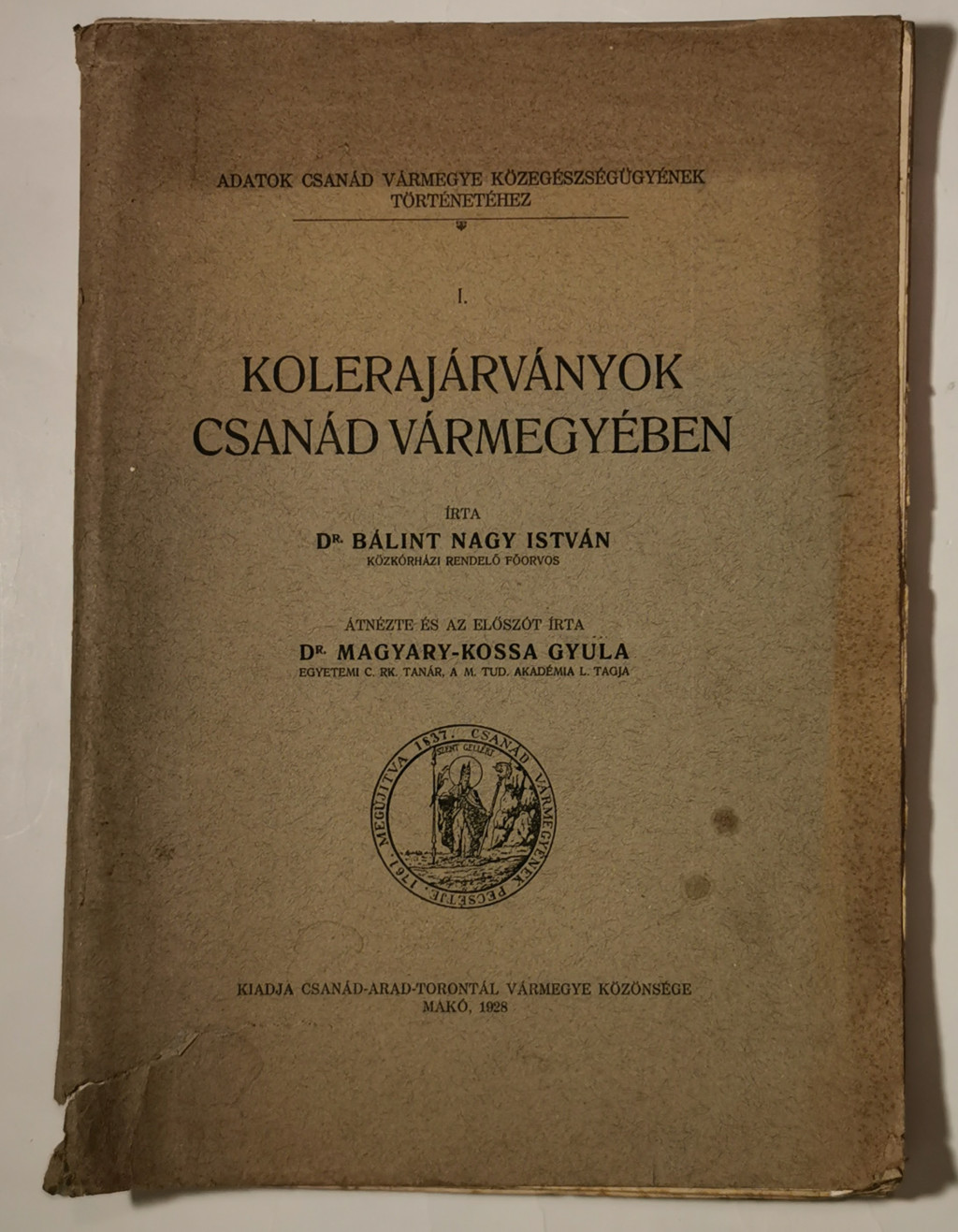 Bálint Nagy István - Kolerajárványok Csanád vármegyében. Átnézte és a előszót írta Magyary-Kossa Gyula. Makó, 1928. Csanád-Arad-Torontál vm. közönsége. 118 p. /Adatok Csanád vármegye közegészségügyének történetéhez I./ Szövegközti képekkel illusztrált.