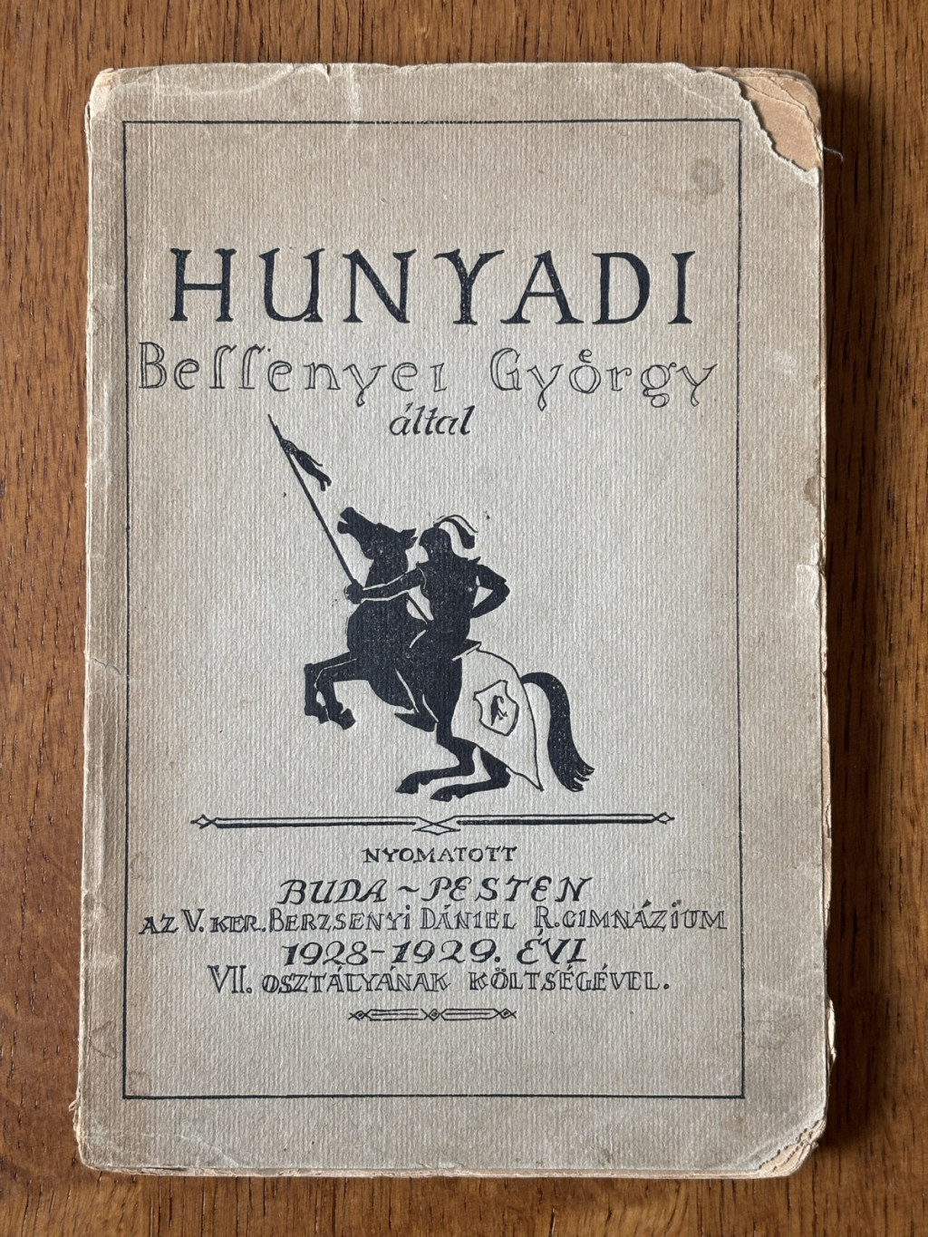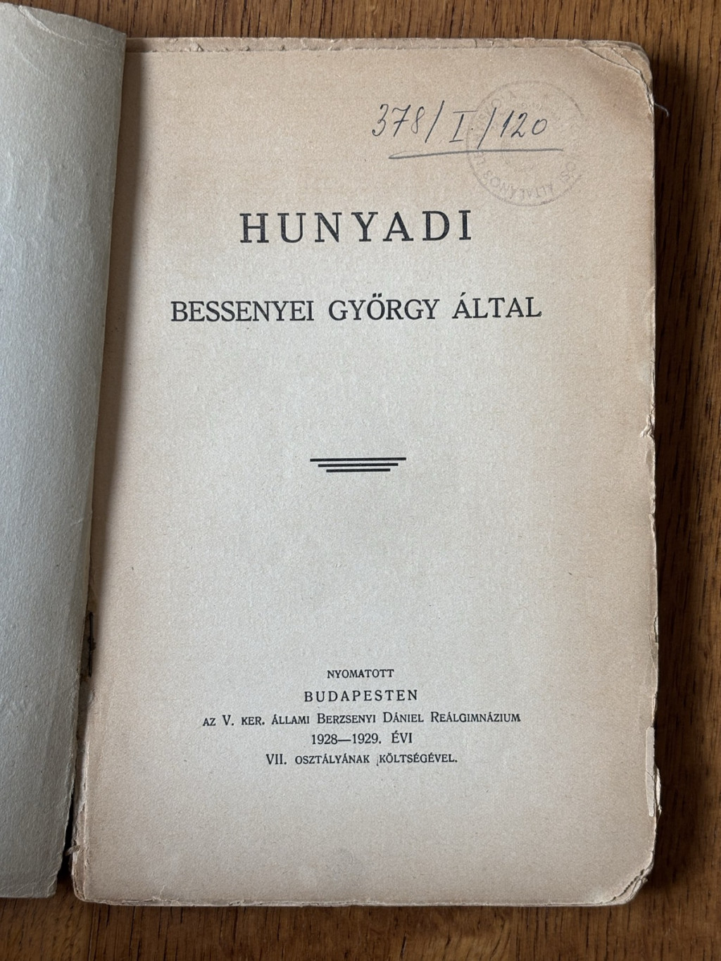 Hunyadi. Bessenyei György által. Ezt a könyvet kiadta 1929. májusában a Budapesti Magyar Királyi Állami "Berzsenyi Dániel" Reálgimnázium 1928-29. évi hetedik osztálya.
