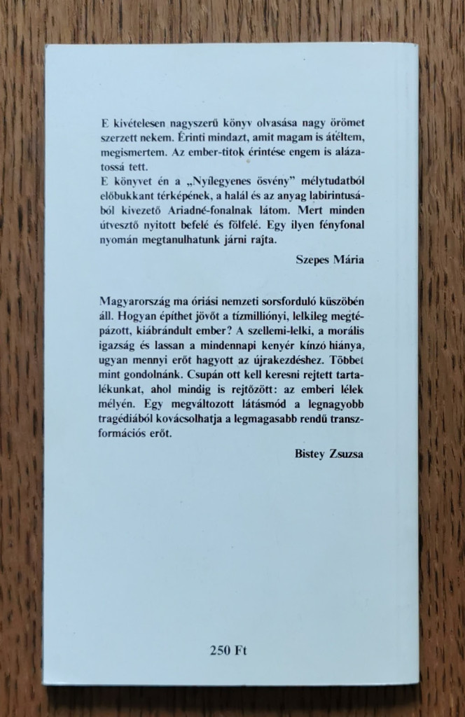 E kivételesen nagyszerű könyv olvasása nagy örömet szerzett nekem. Érinti mindazt; amit magam is átéltem, megismertem. Az ember-titok érintése engem is alázatossá tett. E könyvet én a „Nyílegyenes ösvény” mélytudatból előbukkant térképének, a halál és az anyag labirintusából kivezető Ariadné-fonalnak látom. Mert minden útvesztő nyitott befelé és fölfelé. Egy ilyen fényfonal nyomán megtanulhatunk járni rajta. (Szepes Mária) Magyarország ma óriási nemzeti sorsforduló küszöbén áll. Hogyan építhet jövőt a tízmilliónyi, lelkileg megtépázott, kiábrándult ember? A szellemi-lelki, a morális igazság és lassan a mindennapi kenyér kínzó hiánya, ugyan mennyi erőt hagyott az újrakezdéshez. Többet mint gondolnánk. Csupán ott kell keresni rejtett tartalékunkat, ahol mindig is rejtőzött: az emberi lélek mélyén. Egy megváltozott látásmód a legnagyobb tragédiából kovácsolhatja a legmagasabb rendű transzformációs erőt. (Bistey Zsuzsa)