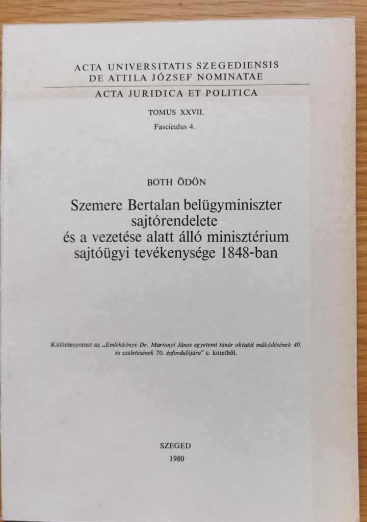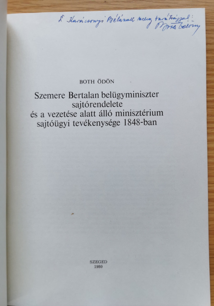 Both Ödön: Szemere Bertalan belügyminiszter sajtórendelete és a vezetése alatt álló minisztérium sajtóügyi tevékenysége 1848-ban (Dedikált!)