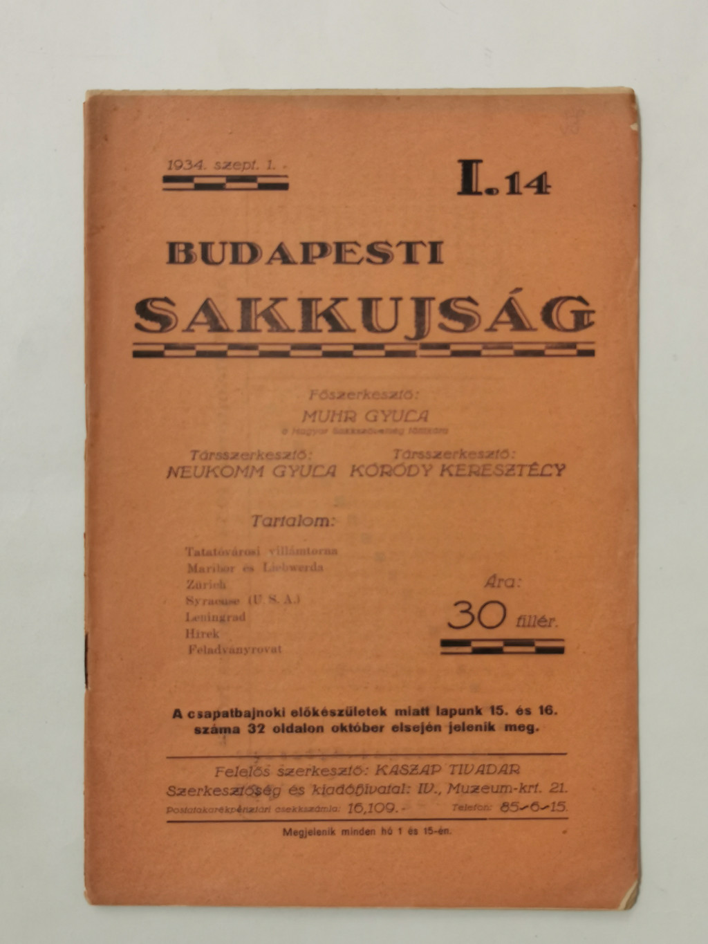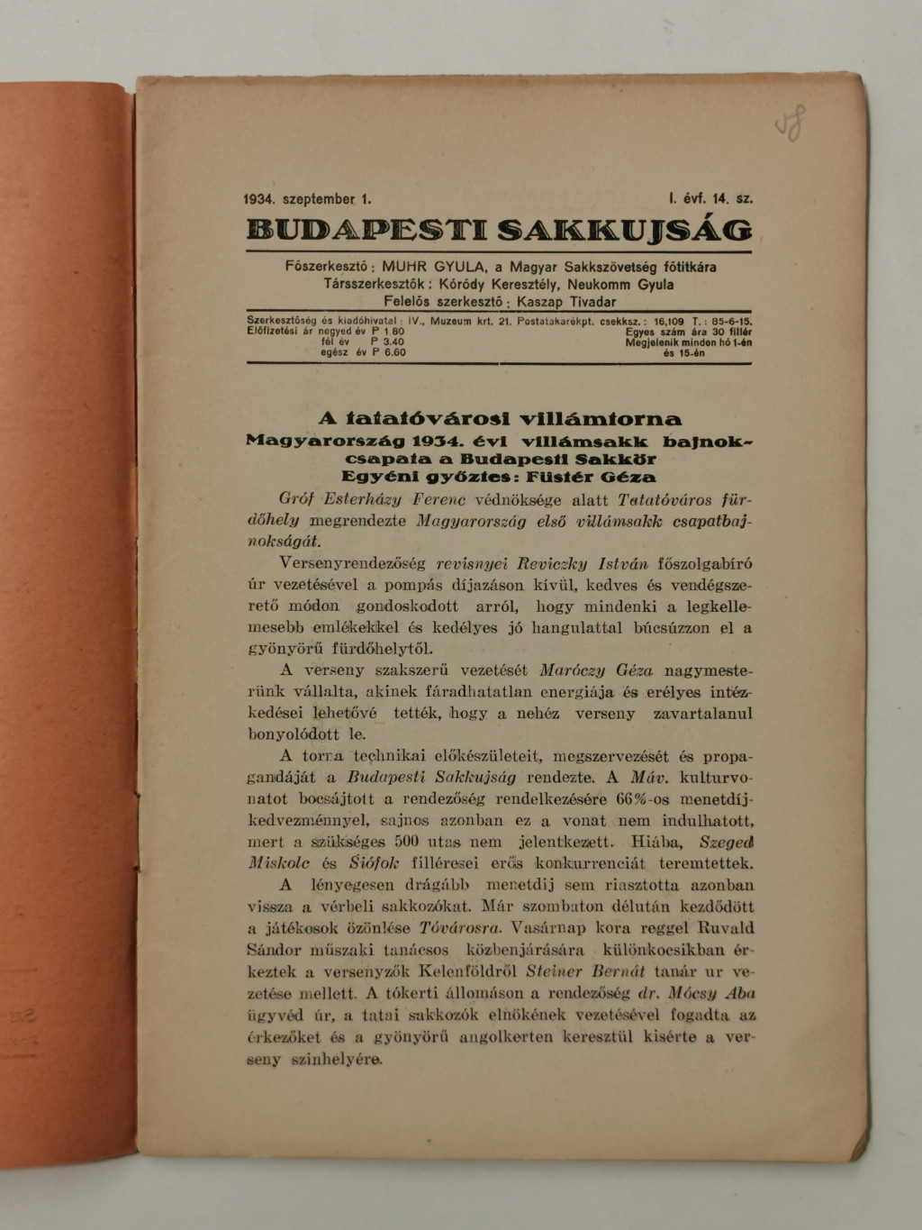Budapesti Sakkujság I. évf. 14. sz. - 1934. szeptember 1.