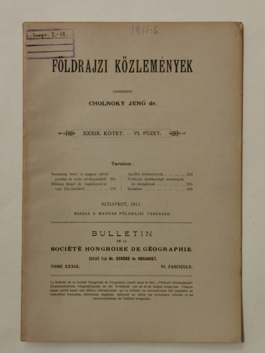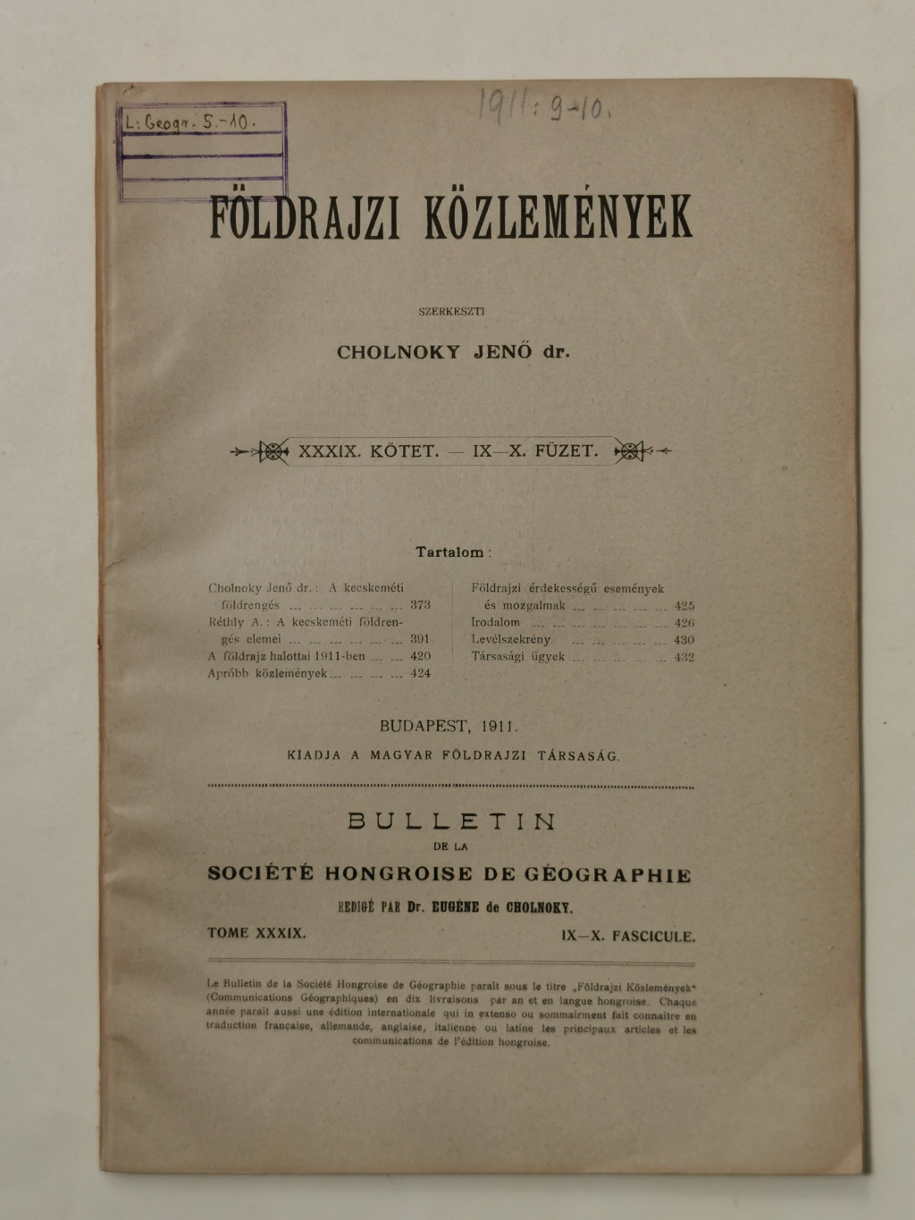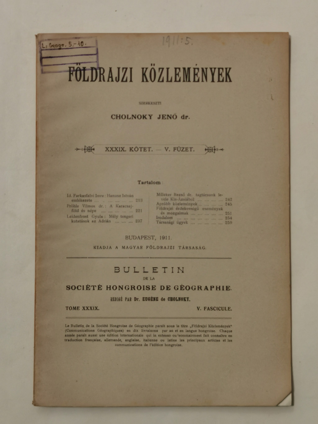 Cholnoky Jenő, Dr.: Földrajzi közlemények XXXIX. évf. I-X. füzet