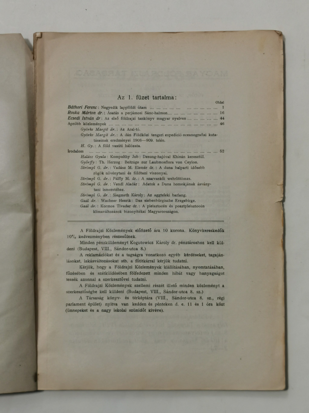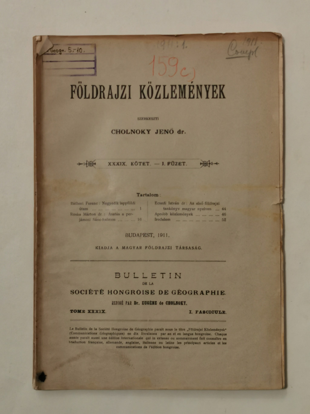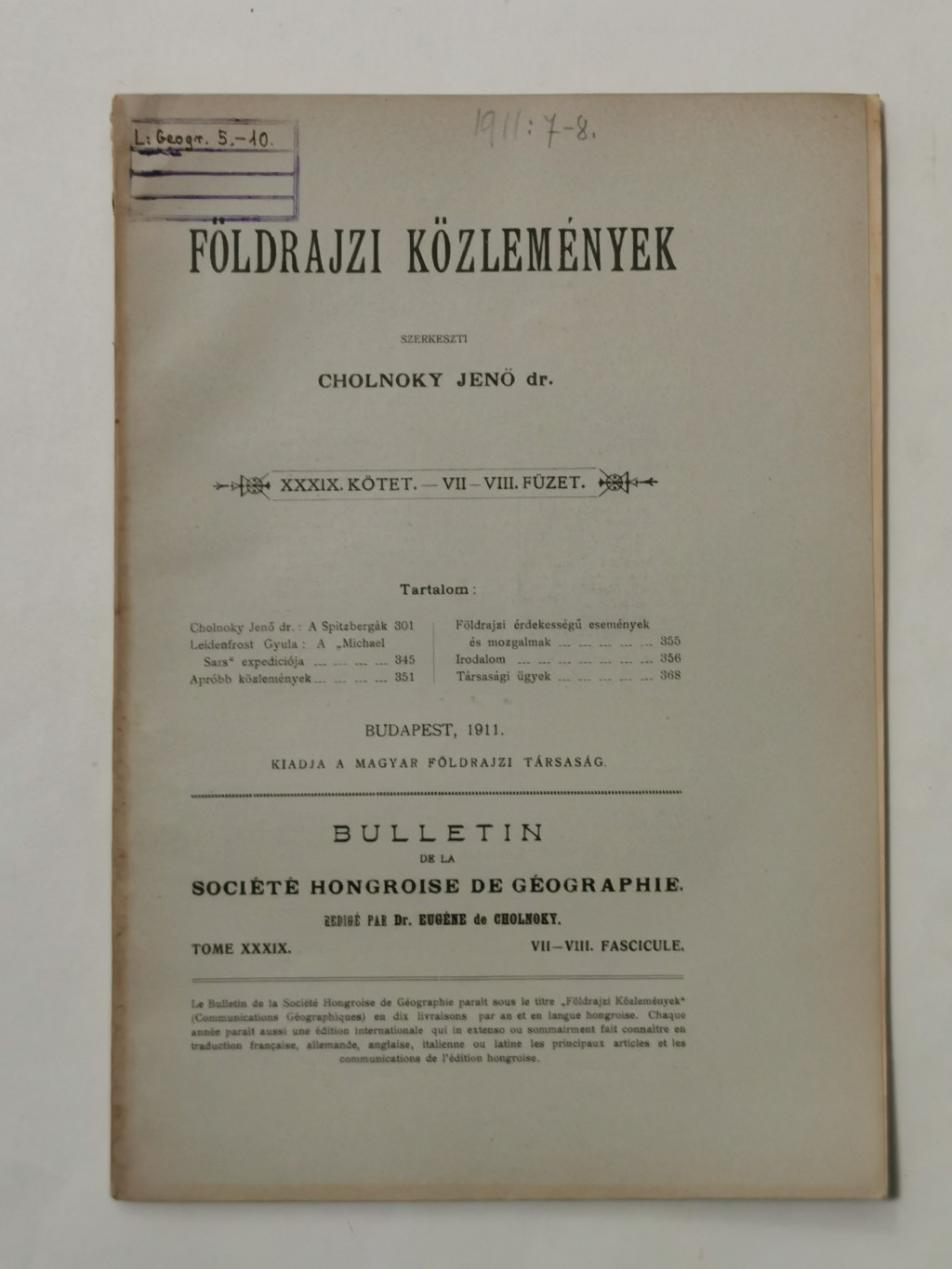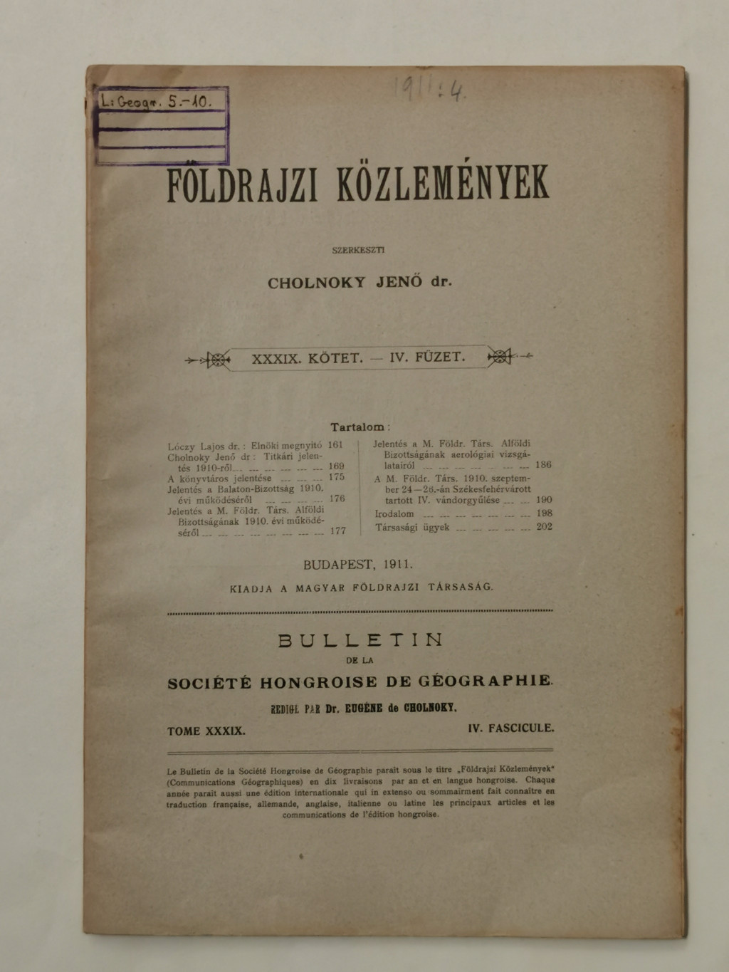 Cholnoky Jenő, Dr.: Földrajzi közlemények XXXIX. évf. I-X. füzet
