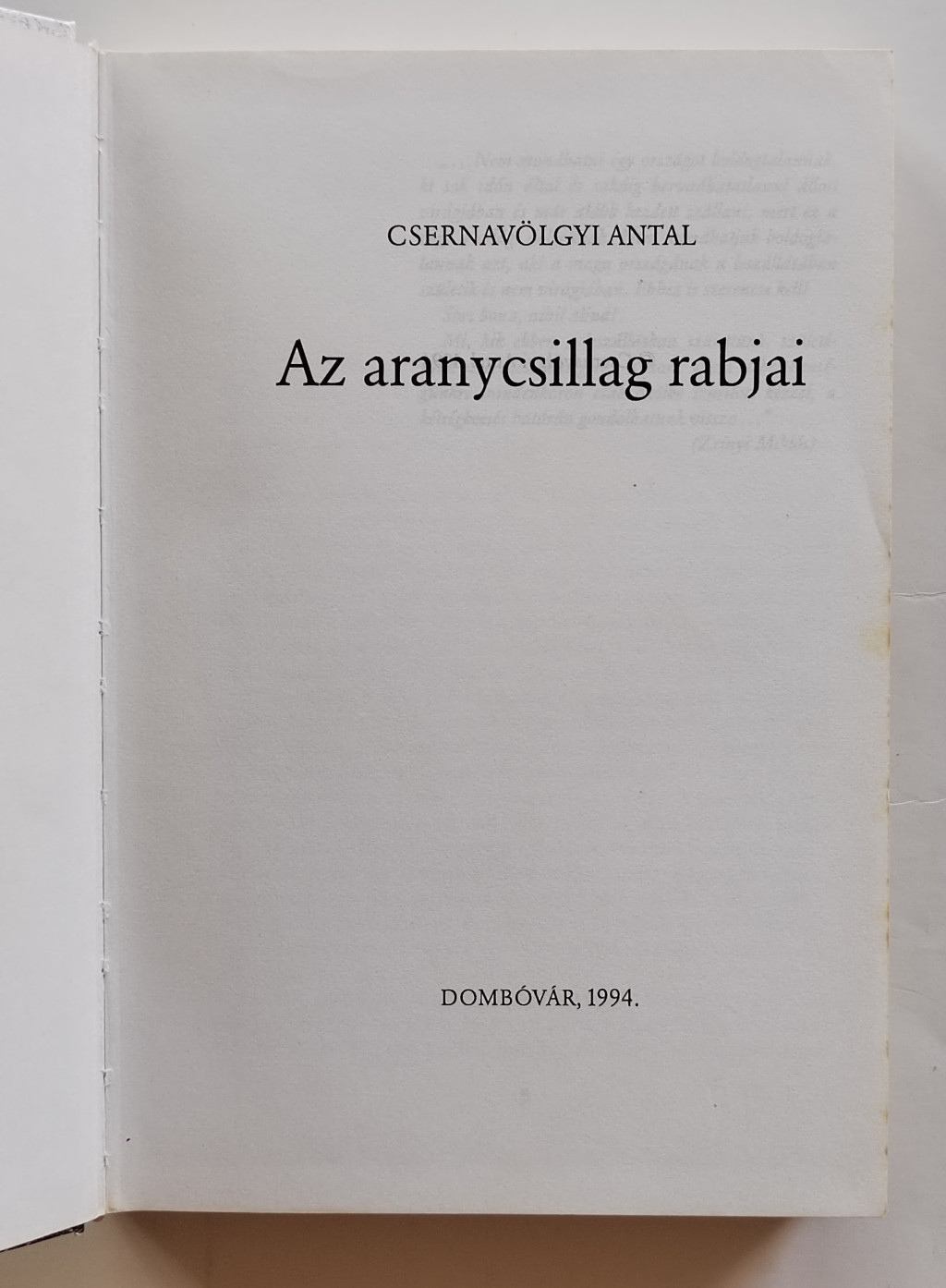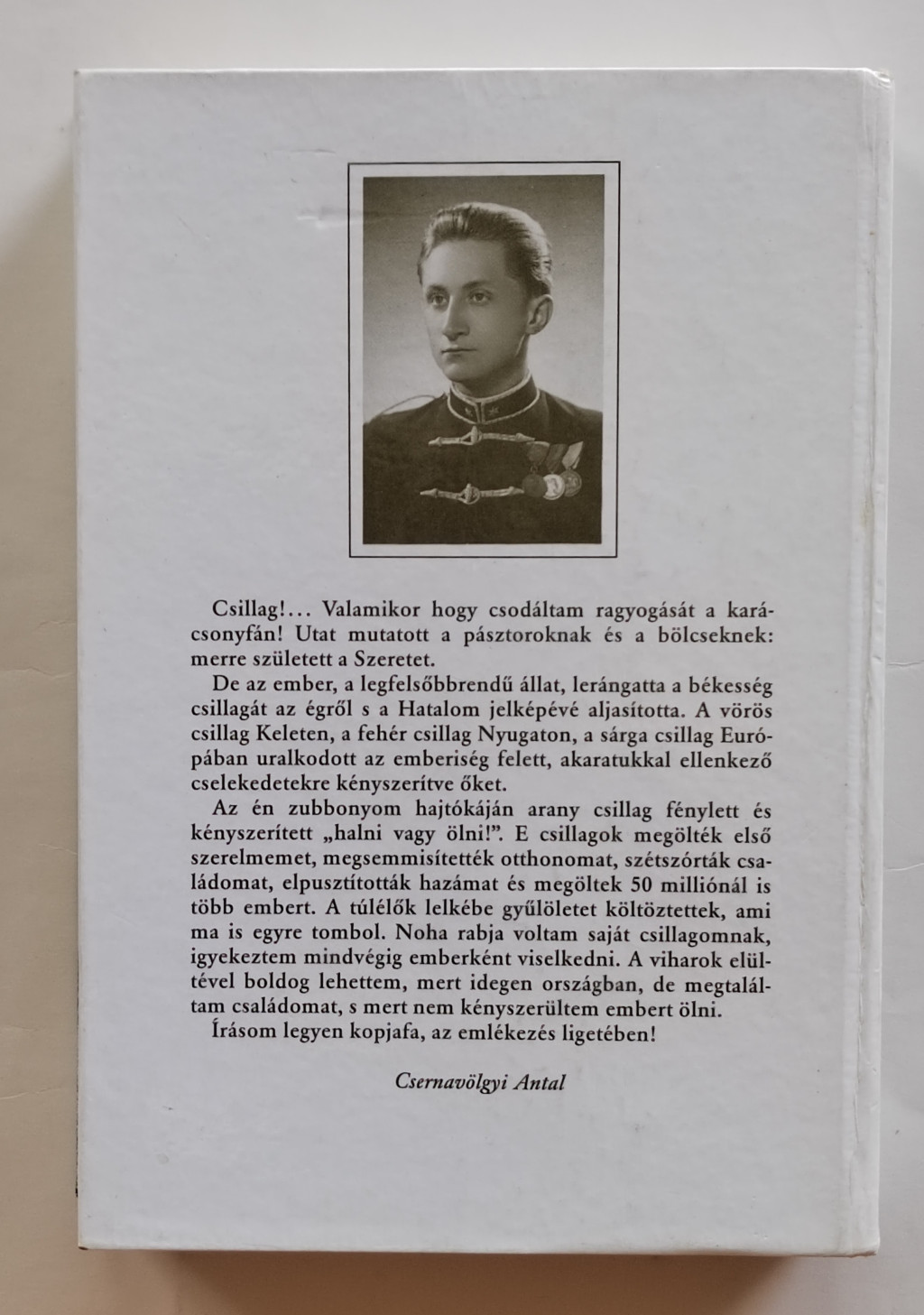 Az én zubbonyom hajtókáján aranycsillag fénylett és kényszerített „halni vagy ölni!”. E csillagok megölték az első szerelmemet, megsemmisítették otthonomat, szétszórták családomat, elpusztították hazámat és megöltek 50 milliónál is több embert. A túlélők lelkébe gyűlöletet költöztettek, ami ma is egyre tombol. Noha rabja voltam saját csillagomnak, igyekeztem mindvégig emberként viselkedni. A viharok elültével boldog lehettem, mert idegen országban, de megtaláltam családomat, s mert nem kényszerültem embert ölni. Írásom legyen kopjafa, az emlékezés ligetében!