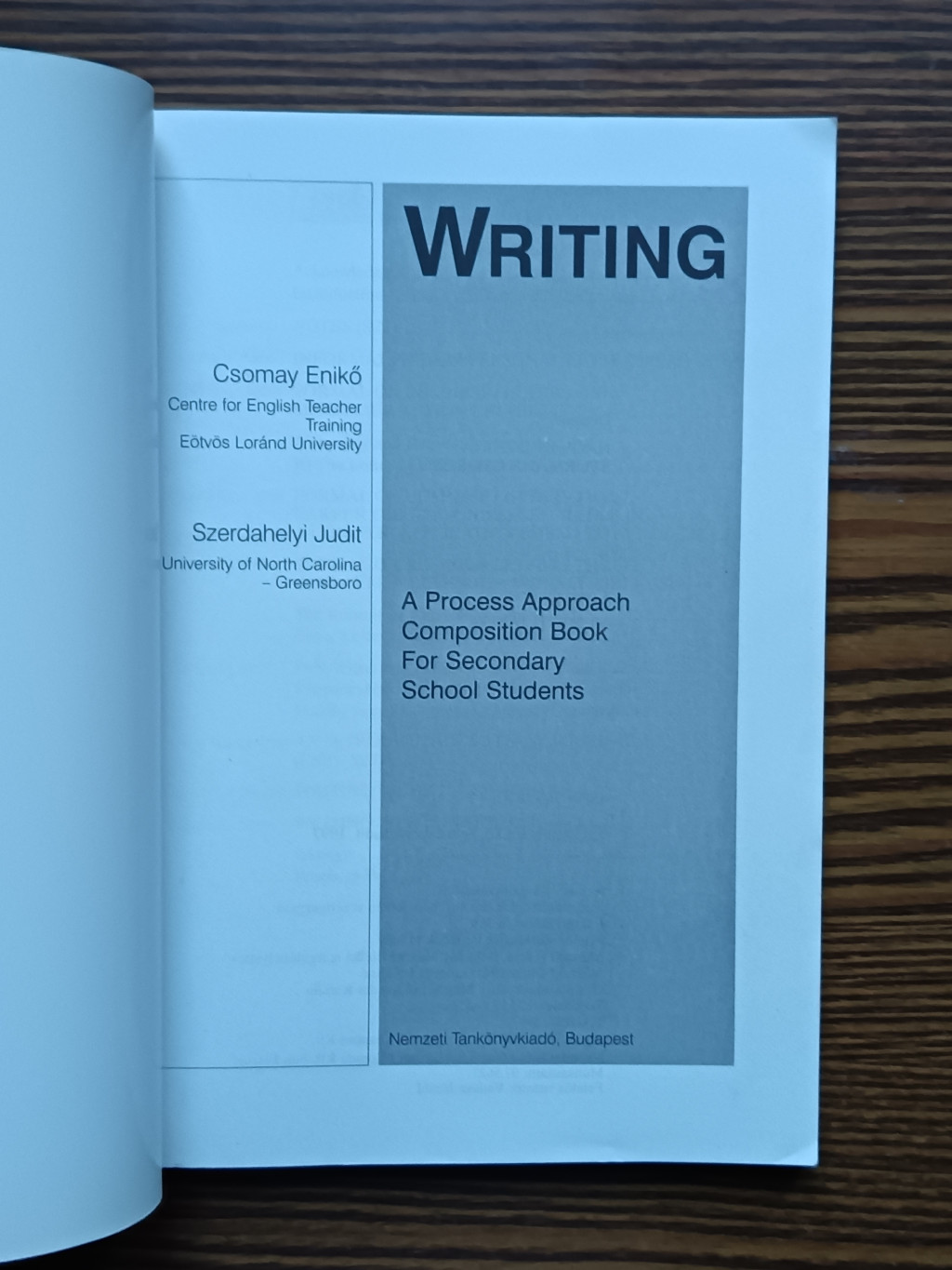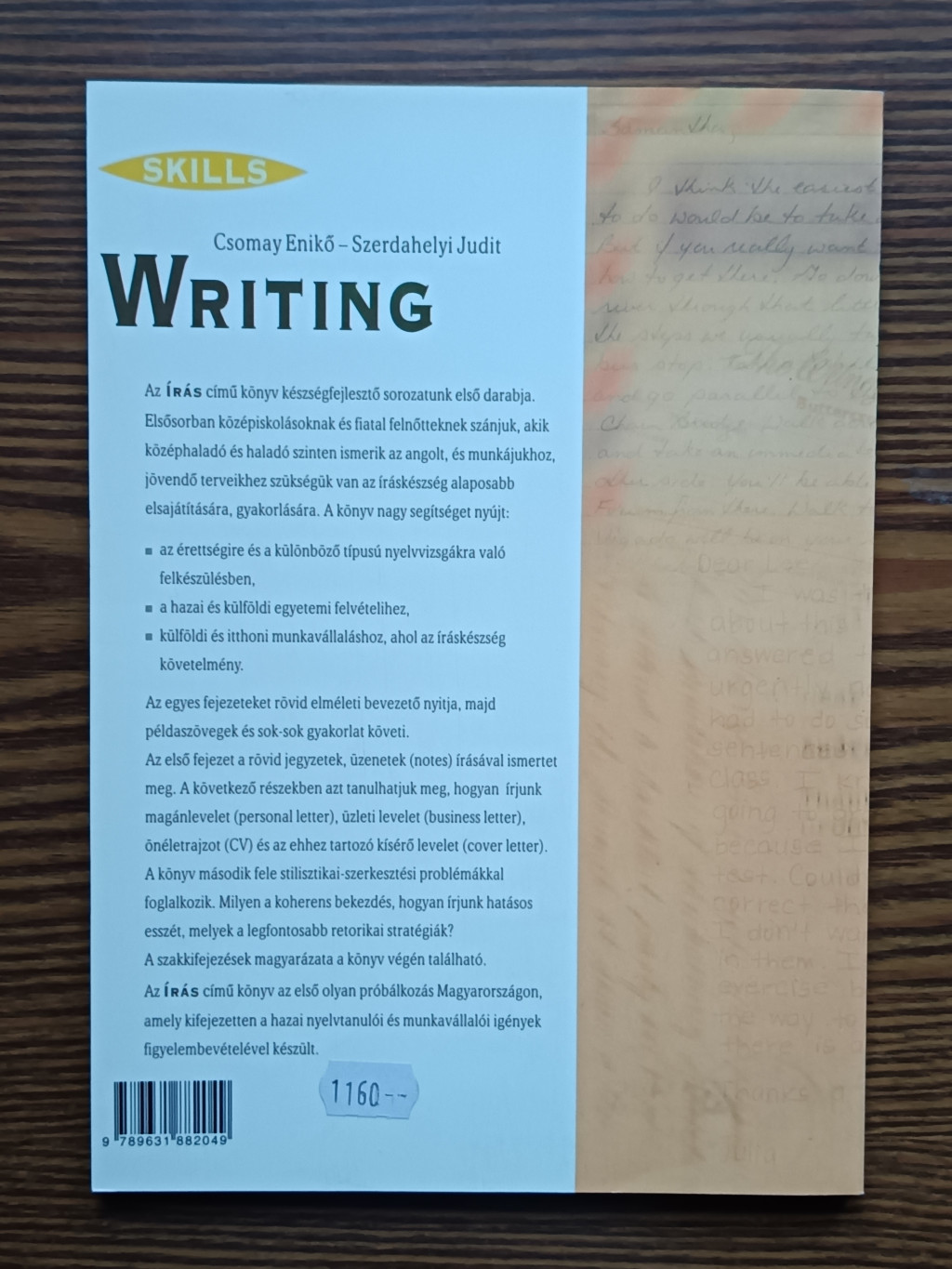 A WRITING című könyv készségfejlesztő sorozatunk első darabja. Elősorban középiskolásoknak és fiatal felnőtteknek szánjuk; akik középhaladó és haladó szinten ismerik az angolt, és munkájukhoz, jövendő terveikhez szükségük van az íráskészség alaposabb elsajátítására, gyakorlására. A könyv nagy segítséget nyújt: – az érettségire és a különböző típusú nyelvvizsgákra való felkészülésben, – a hazai és külföldi egyetemi felvételihez, – a külföldi és itthoni munkavállaláshoz, ahol az angol íráskészség követelmény. Az egyes fejezeteket rövid elméleti bevezető nyitja, majd példaszövegek és sok-sok gyakorlat követi.