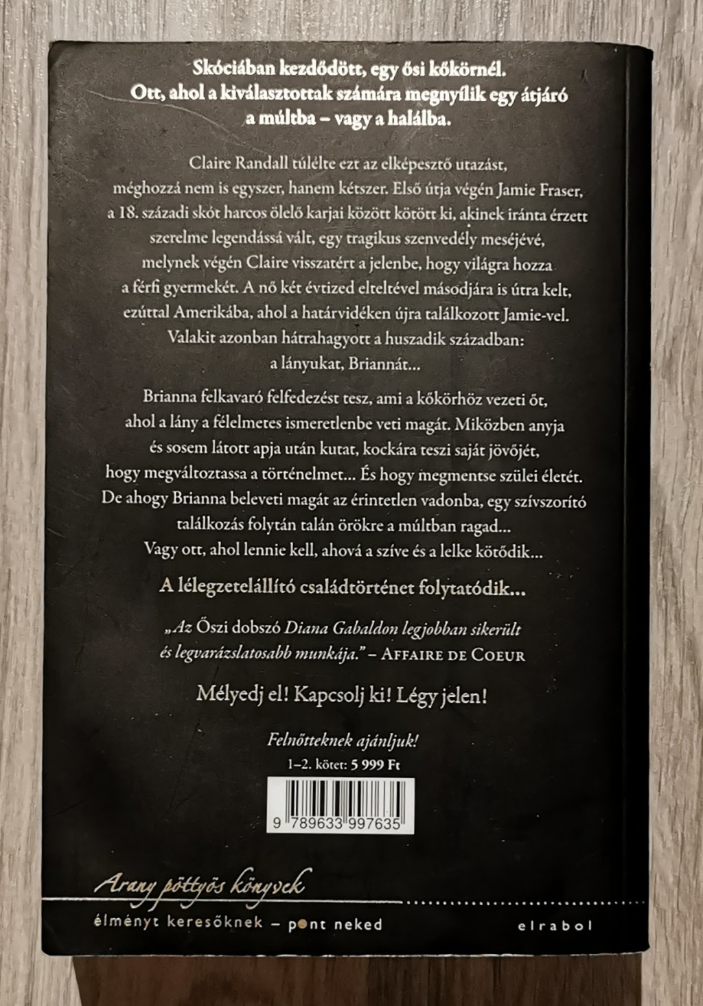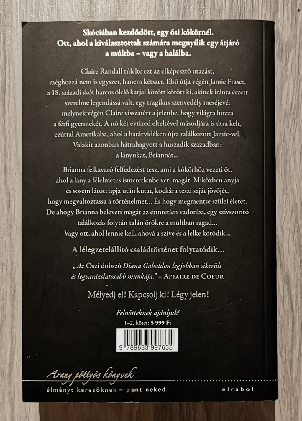 Claire Randall túlélte ezt az elképesztő utazást, méghozzá nem is egyszer, hanem kétszer. Első útja végén Jamie Fraser, a 18. századi skót harcos ölelő karjai között kötött ki, akinek iránta érzett szerelme legendássá vált – egy tragikus szenvedély meséjévé, melynek végén Claire visszatért a jelenbe, hogy világra hozza a férfi gyermekét. A nő két évtized elteltével másodjára is útra kelt, ezúttal Amerikába, ahol a határvidéken újra találkozott Jamie-vel. Valakit azonban hátrahagyott a huszadik században: a lányukat, Briannát…