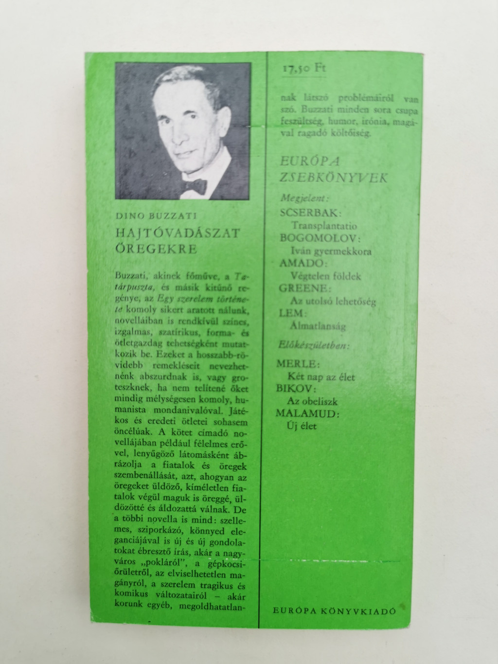 Buzzati, akinek főműve, a Tatárpuszta, és második kitűnő regénye, az Egy szerelem története, komoly sikert aratott nálunk, novelláiban is rendkívül színes, izgalmas, szatirikus, forma- és ötletgazdag tehetségnek mutatkozik. Ezeket a hosszabb-rövidebb abszurd-groteszk remekléseket szerzőjük mindig mélységesen komoly, humanista mondanivalóval telíti. Játékos és eredeti ötletei sohasem öncélúak. A kötet címadó novellájában például félelmes erővel, lenyűgöző látomásként ábrázolja a fiatalok és öregek szembenállását, azt, ahogyan az öregeket üldöző, kíméletlen fiatalok végül maguk is öreggé, üldözötté és áldozattá válnak. De a többi novella is mind: szellemes, sziporkázó, könnyed eleganciával is új és új gondolatokat ébresztő írás, akár a nagyváros "pokláról", a gépkocsiőrületről, az elviselhetetlen magányról, a szerelem tragikus és komikus változatairól, akár korunk egyéb, megoldhatatlannak látszó problémáiról van szó – Buzzati minden sora csupa feszültség, humor, magával ragadó költőiség.