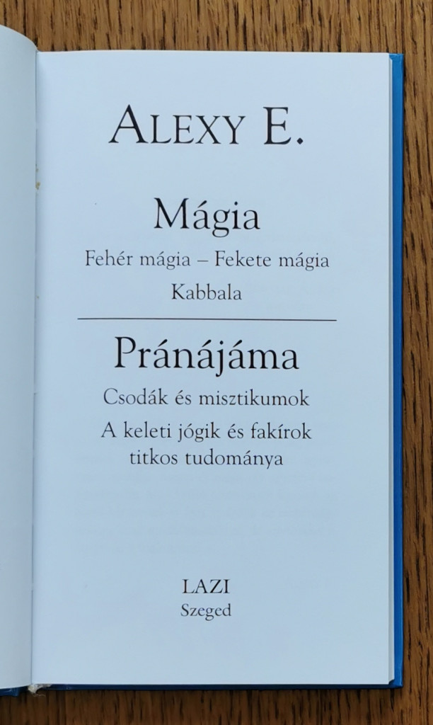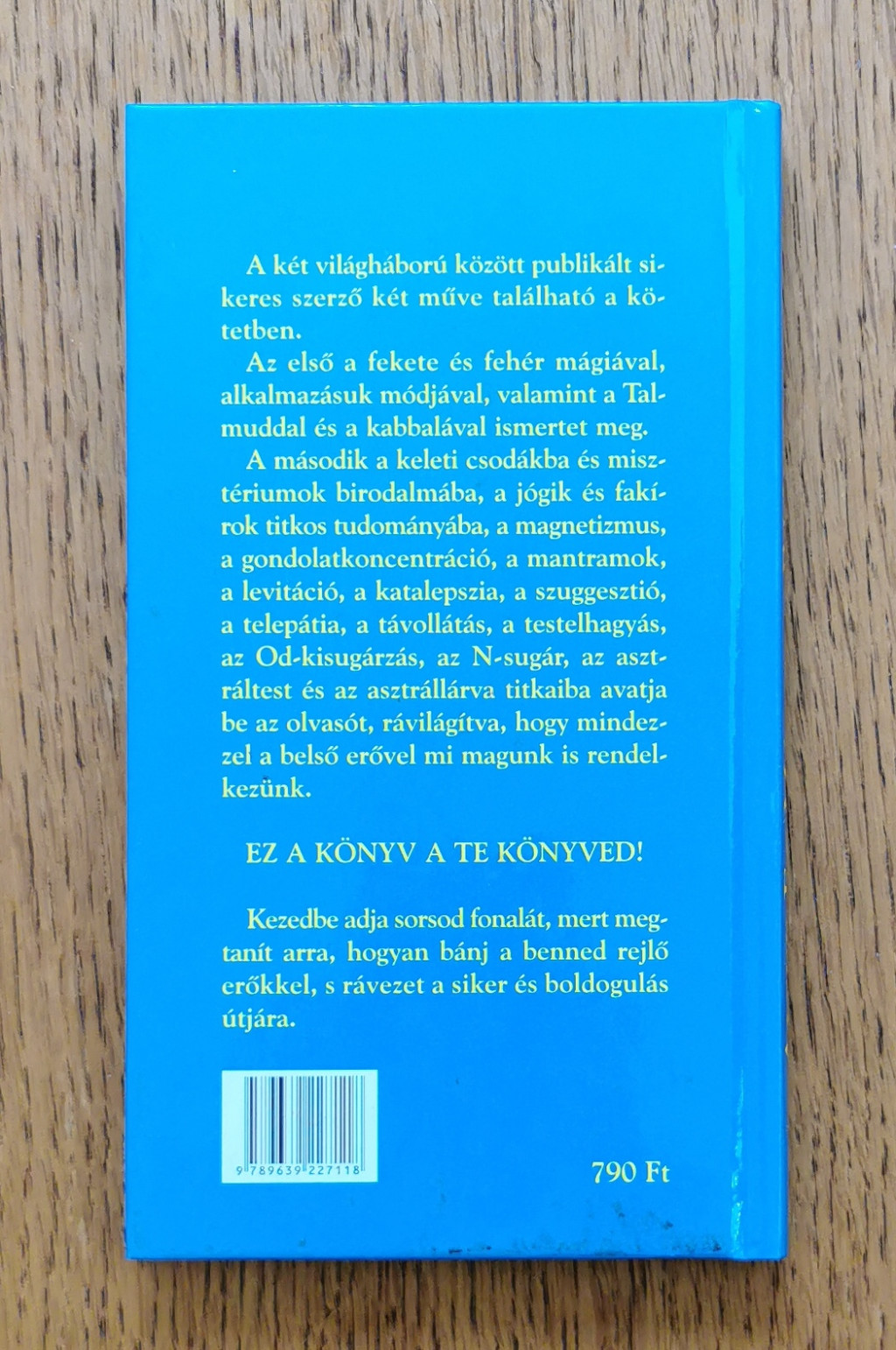 A két világháború között publikált sikeres szerző két műve található a kötetben. Az első a fekete és fehér mágiával; alkalmazásuk módjával, valamint a Talmuddal és a kabbalával ismertet meg. A második a keleti csodákba és misztériumok birodalmába, a jógik és fakírok titkos tudományába, a magnetizmus, a gondolatkoncentráció, a mantramok, a levitáció, a katalepszia, a szuggesztió, a telepátia, a távollátás, a testelhagyás, az Od-kisugárzás, az N-sugár, az asztráltest és az asztrállárva titkaiba avatja be az olvasót, rávilágítva, hogy mindezzel a belső erővel mi magunk is rendelkezünk.