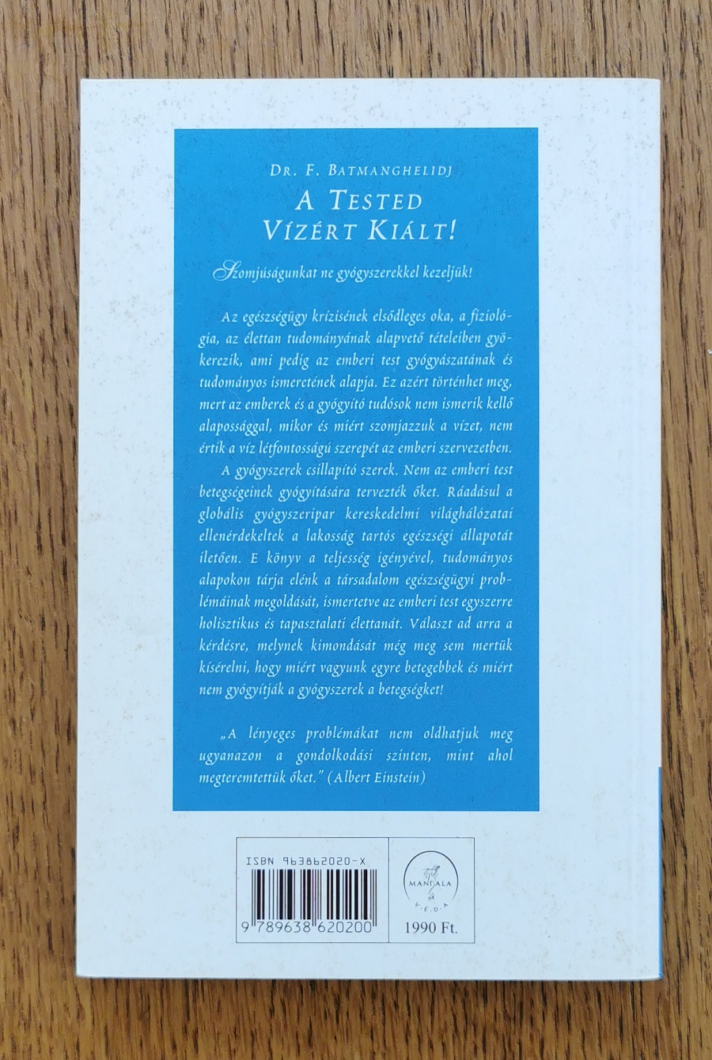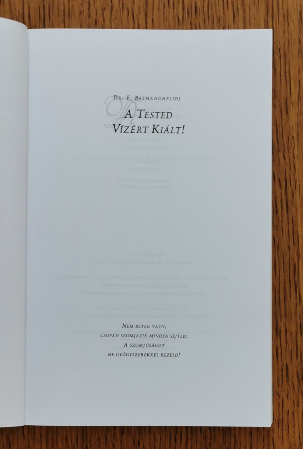 Az egészségügy krízisének elsődleges oka; a fiziológia, az élettan tudományának alapvető tételeiben gyökerezik, ami pedig az emberi test gyógyászatának és tudományos ismeretének alapja. Ez azért történhet meg, mert az emberek és a gyógyító tudósok nem ismerik kellő alapossággal, mikor és miért szomjazzuk a vizet, nem értik a víz létfontosságú szerepét az emberi szervezetben. A gyógyszerek csillapító szerek. Nem az emberi test betegségeinek gyógyítására tervezték őket. E könyv a teljesség igényével, tudományos alapokon tárja elénk a társadalom egészségügyi problémáinak megoldását, ismertetve az emberi test egyszerre holisztikus és tapasztalati élettanát.