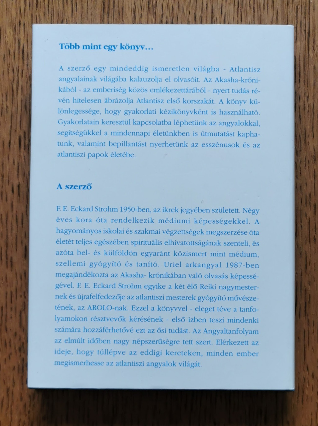 A szerző egy mindeddig ismeretlen világba - Atlantisz angyalainak világába kalauzolja el olvasóit. Az Akasha-krónikából - az emberiség közös emlékezettárából - nyert tudás révén hitelesen ábrázolja Atlantisz első korszakát. A könyv különlegessége; hogy gyakorlati kézikönyvként is használható. Gyakorlatain keresztül kapcsolatba léphetünk az angyalokkal, segítségükkel a mindennapi életünkben is útmutatást kaphatunk, valamint bepillantást nyerhetünk az esszénusok és az atlantiszi papok életébe.