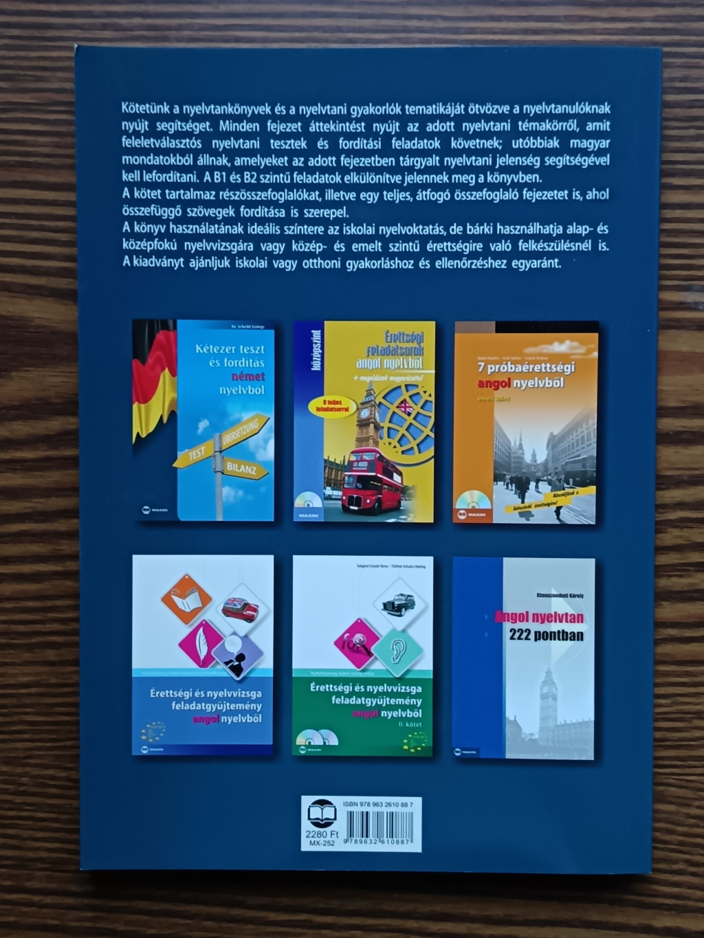 Kötetünk a nyelvtankönyvek és a nyelvtani gyakorlók tematikáját ötvözve a nyelvtanulóknak nyújt segítséget. Minden fejezet áttekintést nyújt az adott nyelvtani témakörről; amit feleletválasztós nyelvtani tesztek és fordítási feladatok követnek; utóbbiak magyar mondatokból állnak, melyeket az adott fejezetben tárgyalt nyelvtani jelenség segítségével kell lefordítani. A B1 és B2 szintű feladatok elkülönítve jelennek meg a könyvben. A kötet tartalmaz részösszefoglalókat, illetve egy teljes, átfogó összefoglaló fejezetet is, ahol összefüggő szövegek fordítása is szerepel. A könyv használatának ideális színtere az iskolai nyelvoktatás, de bárki használhatja alap- és középfokú nyelvvizsgára vagy közép- és emelt szintű érettségire való felkészülésnél is. A kiadványt ajánljuk iskolai vagy otthoni gyakorláshoz és ellenőrzéshez egyaránt.