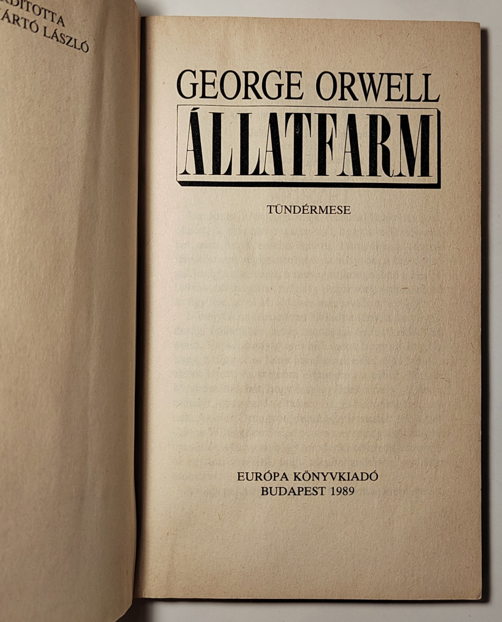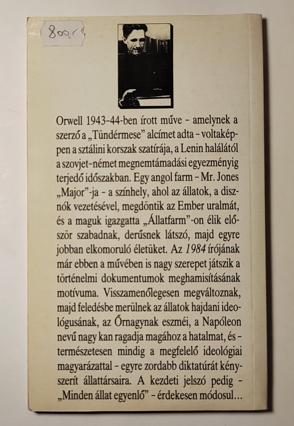 Orwell 1943/44-ben írott műve – amelynek a szerző a Tündérmese alcímet adta – ténylegesen a sztálini korszak szatírája, a Lenin halálától a szovjet-német megnemtámadási egyezményig terjedő időszakban, de természetesen minden elnyomó, totalitárius rendszerre ráillik. Egy angol farm – Mr . Jones Major-ja – a színhely, ahol az állatok a disznók vezetésével megdöntik az Ember uralmát, és a maguk igazgatta Állatfarm-on élik először szabadnak, derűsnek látszó, majd egyre jobban elkomoruló életüket. Az 1984 írójának már ebben a művében is nagy szerepet játszik a történelmi dokumentumok meghamisításának motívuma. Visszamenőlegesen megváltoznak, majd feledésbe merülnek az állatok hajdani ideológusának, az Őrnagynak eszméi, a Napóleon nevű nagy kan ragadja magához a hatalmat, és – természetesen mindig a megfelelő ideológiai magyarázattal – egyre zordabb diktatúrát kényszerít állattársaira. A kezdeti jelszó pedig – Minden állat egyenlő – érdekesen módosul…