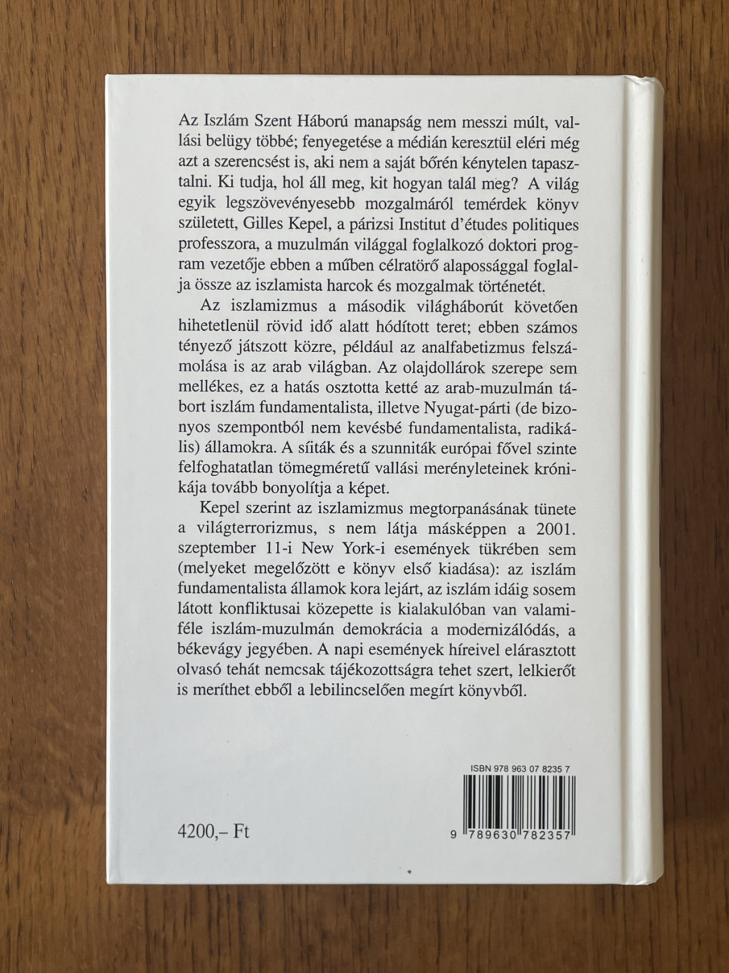 Az Iszlám Szent Háború manapság nem messzi múlt, vallási belügy többé; fenyegetése a médián keresztül eléri még azt is, aki nem a saját bőrén kénytelen tapasztalni. Ki tudja, hol áll meg, kit hogyan talál meg? A világ egyik legszövevényesebb mozgalmáról temérdek könyv született, Gilles Kepel, a párizsi Institut d'études politiques professzora, a muzulmán világgal foglalkozó doktori program vezetője ebben a műben célratörő alapossággal foglalja össze az iszlamista harcok és mozgalmak történetét. Az iszlamizmus a második világháborút követően hihetetlenül rövid ido alatt hódított teret; ebben számos tényező játszott közre, például az analfabetizmus felszámolása is az arab világban. Az olajdollárok szerepe sem mellékes, ez a hatás osztotta ketté az arab-muzulmán tábort iszlám-fundamentalista, illetve nyugat-párti (de bizonyos szempontból nem kevésbé fundamentalista, radikális) államokra. A síiták és a szunniták európai fővel szinte felfoghatatlan tömegméretű vallási merényleteinek krónikája tovább bonyolítja a képet. Kepel szerint az iszlamizmus megtorpanásának tünete a világterrorizmus, s nem látja másképpen a 2001. szeptember 11-i New York-i események tükrében sem (melyeket megelőzött e könyv első kiadása): az iszlám fundamentalista államok kora lejárt, az iszlám idáig sosem látott konfliktusai közepette is kialakulóban van valamiféle iszlám-muzulmán demokrácia a modernizálódás, a békevágy jegyében. A napi események híreivel elárasztott olvasó tehát nem csak tájékozottságra tehet szert, lelkierőt is meríthet ebből a lebilincselően megírt könyvből.