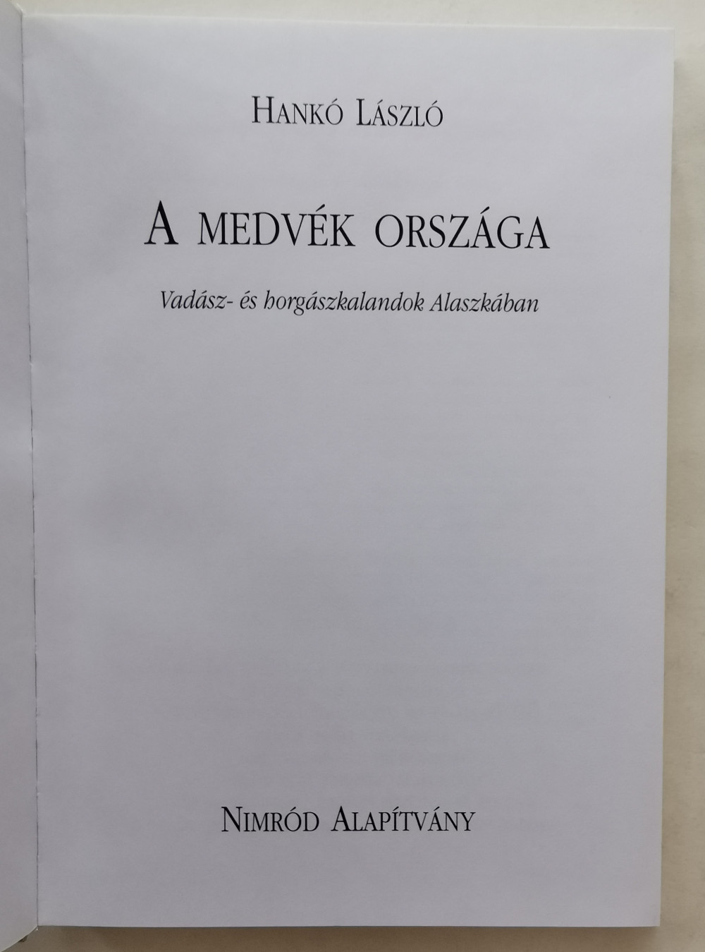 A Nimród Alapítvány vadászéletek legemlékezetesebb eseményeit megörökítő sorozatába illeszkedve; most Hankó László medveországban, azaz Alaszkában átélt vadász- és horgászélményeit gyűjtötte kötetbe. A szerző által készített színes és fekete-fehér fotók kíséretében, krónika-szerűen, ugyanakkor az izgalmas pillanatok drámaiságát visszaadva fogalmazza meg vadászatainak történetét. Vadász-ars poeticáját jól illusztrálják az előszóban leírtak: Nem tartozom azok közé, akiknek a legfőbb célja minden vadból minél többet zsákmányolni, és undorodom a vadászirodalomban elterjedt öndicsérettől, öngratulációktól. Tisztelem azokat, akik egyedül járják a természetet, bár szerintem az esti tábortűz körül eltöltött meghitt órák, a vadász- vagy horgásztárssal megosztott élmények, örömök, bánatok, a csendes beszélgetések teszik teljessé a vadonban töltött napjainkat.