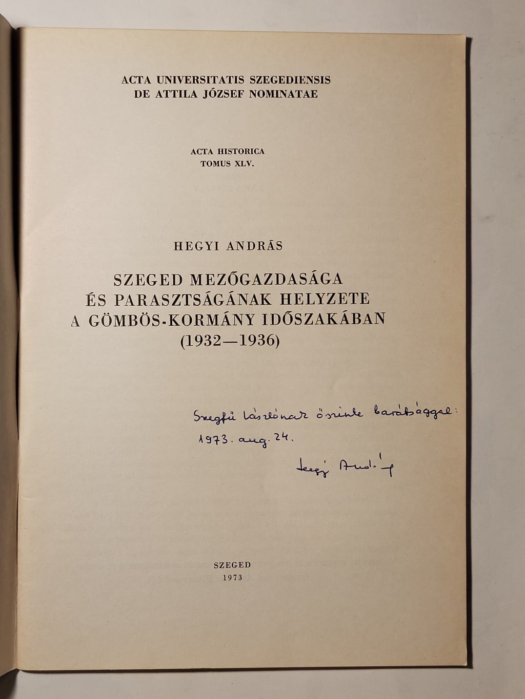 Hegyi Andárs: Szeged mezőgazdasága és parasztságának helyzete a Gömbös-kormány időszakában (1932-1936) (Dedikált)