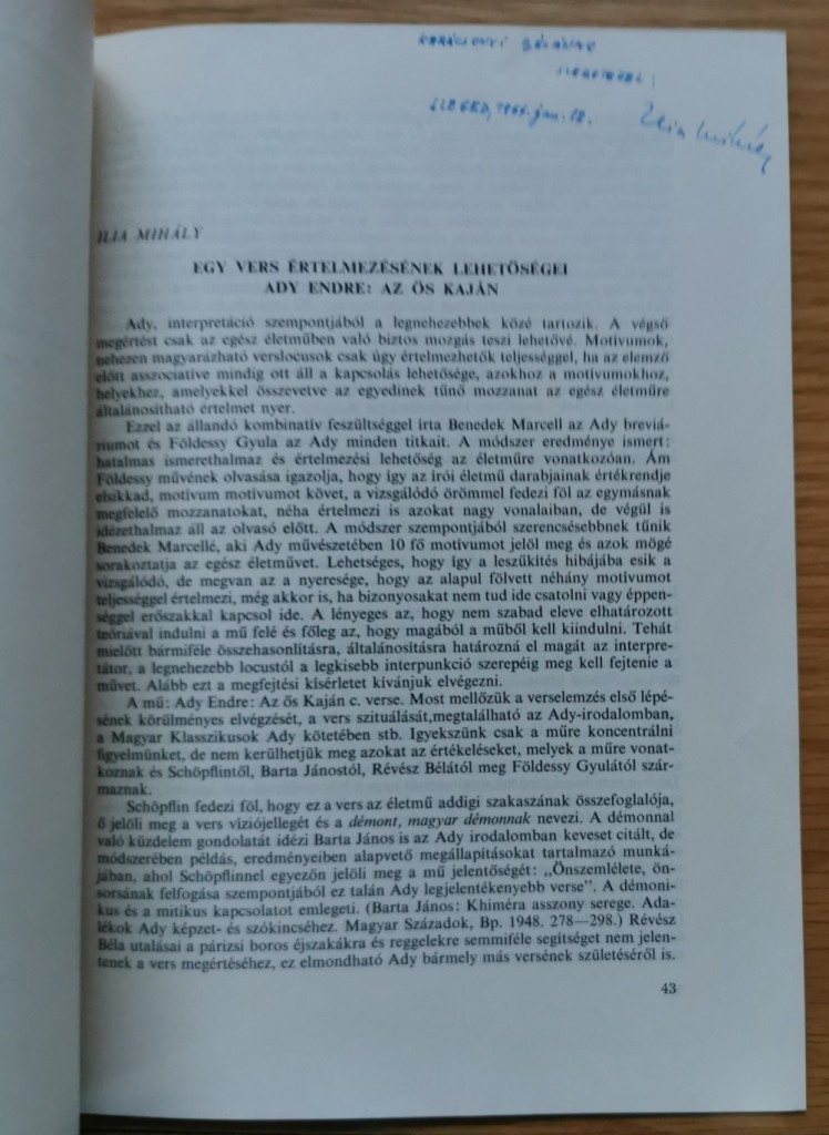 Ilia Mihály: Egy vers értelmezésének lehetőségei Ady Endre: Az ős kaján (Dedikált!)