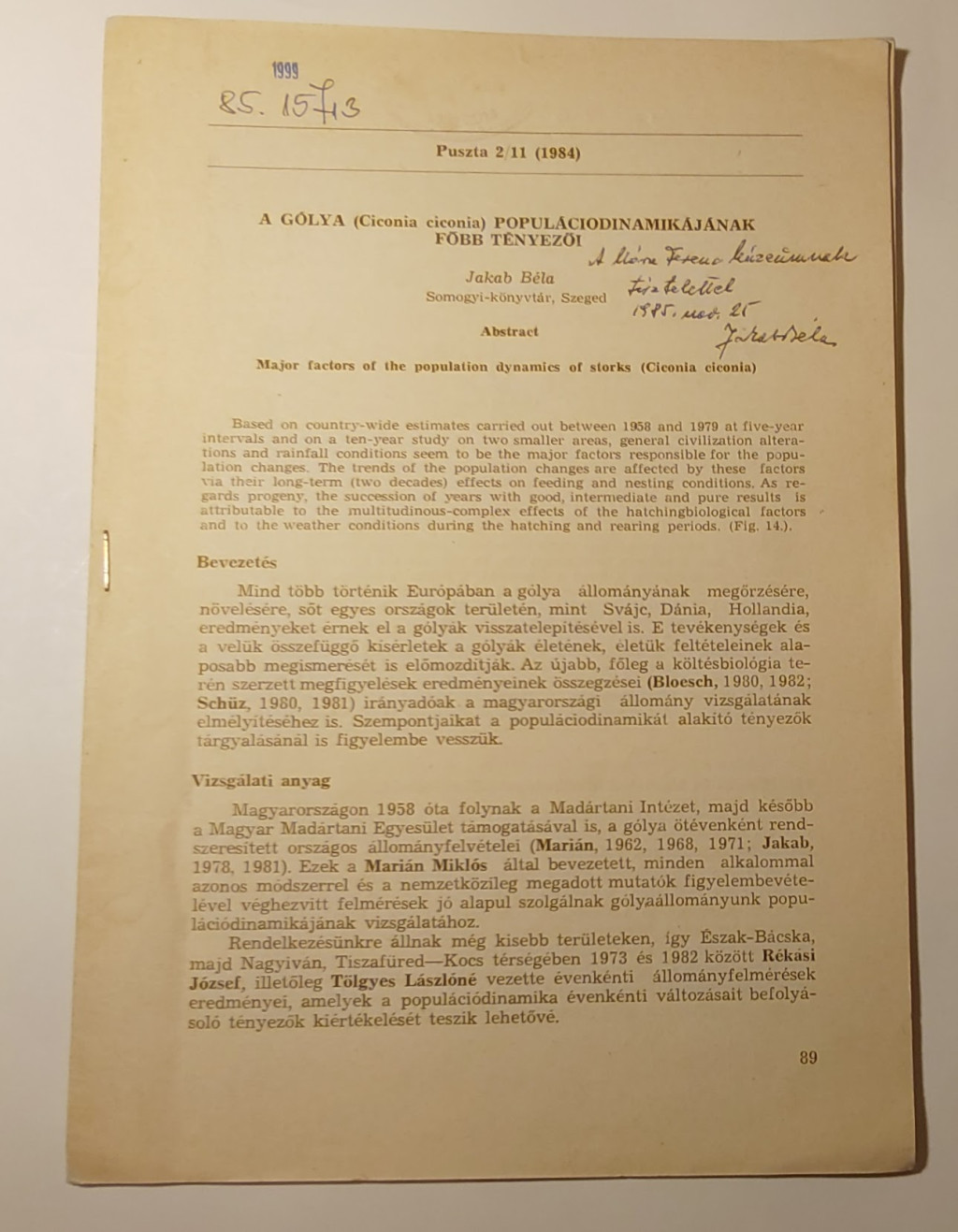 Jakab Béla: A gólya (Ciconia ciconia) populáciodinamikájának főbb tényezői (Dedikált)