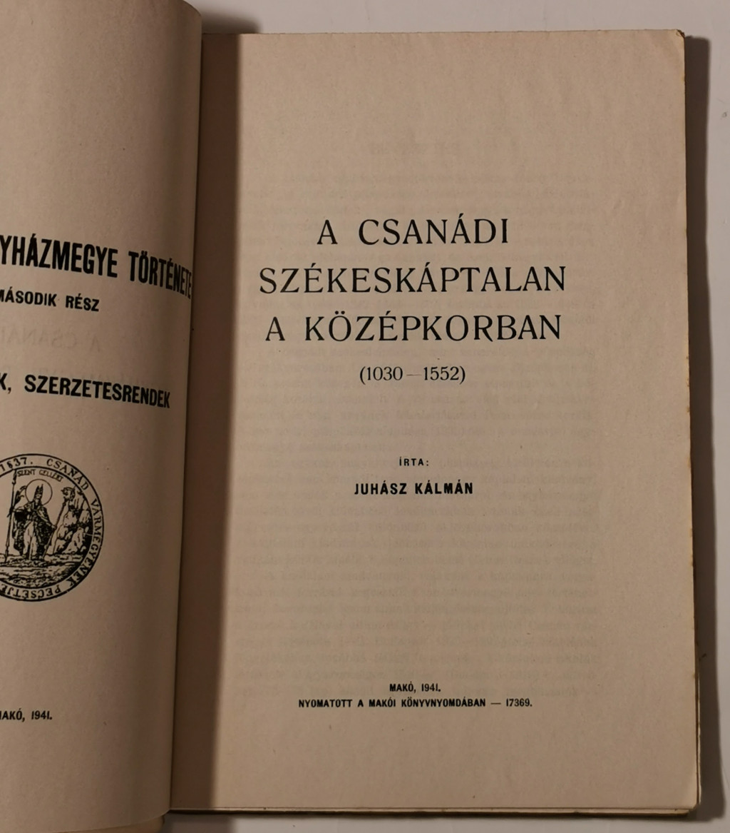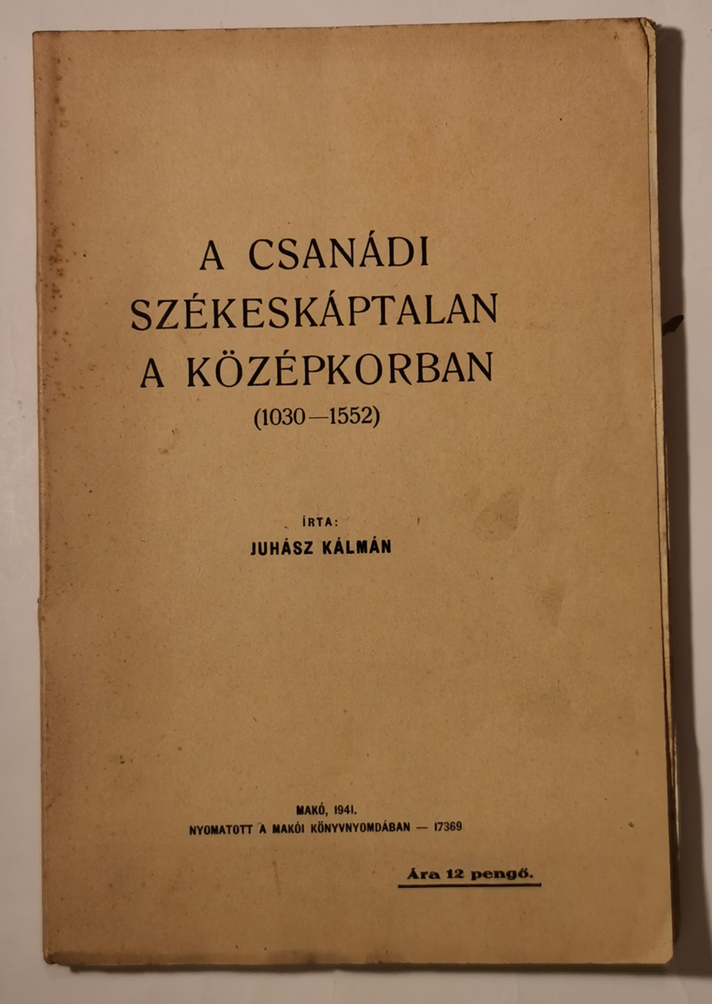 Juhász Kálmán: A csanádi székeskáptalan a középkorban (1030-1552). Makó 1941. Makói könyvny. 163 p. /A csanádi egyházmegye története II. rész: Káptalanok, szerzetesrendek. - Csanádvármegyei könyvtár 38./ A lapszámozáson belül 5 egészoldalas képpel, hasonmással.
