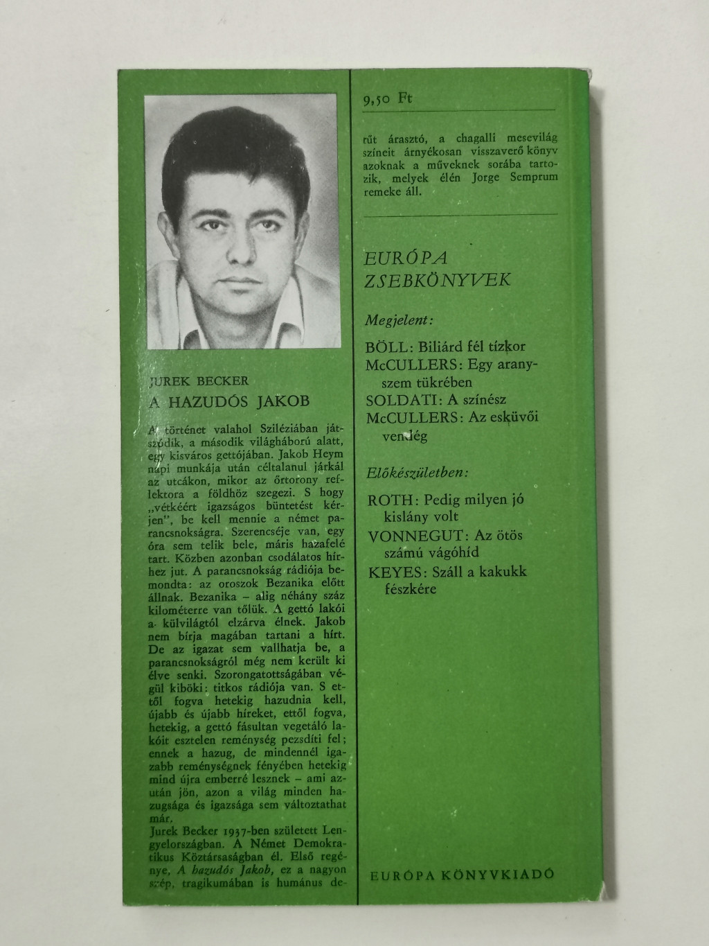 Jurek Becker 1937-ben született Lengyelországban. A Német Demokratikus Köztársaságban él. Első regénye, A hazudós Jakob, ez a nagyon szép, tragikumában is humánus derűt árasztó, a chagalli mesevilág színeit árnyékosan visszaverő könyv azoknak a műveknek sorába tartozik, melyek élén Jorge Semprun remeke áll.
