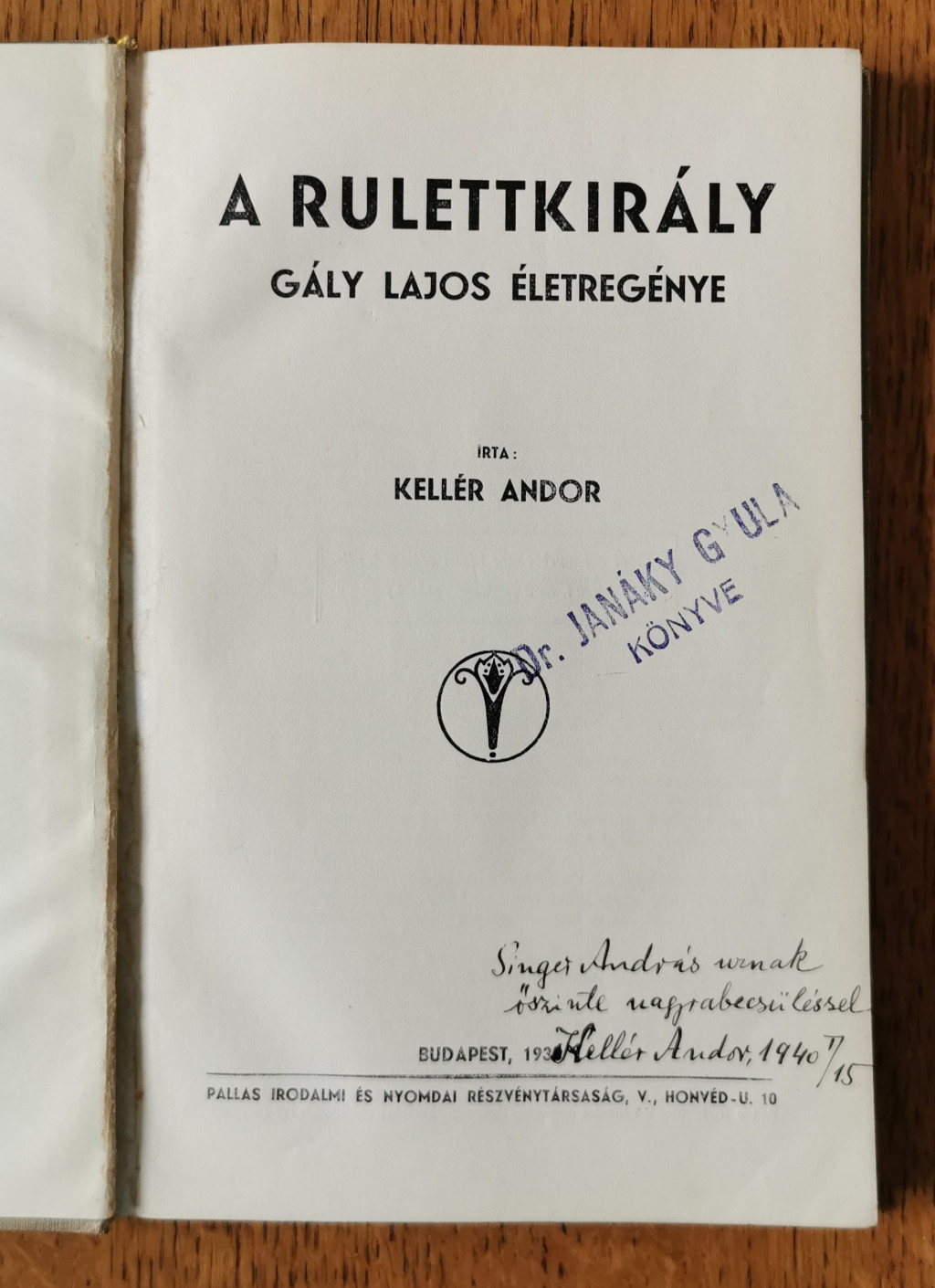 Kellér Andor: A rulettkirály. Gály Lajos életregénye Bp., 1936. Pallas. 99 p. Első kiadás! Számozott! Ebből a könyvből 100 kézzel számozott példány készült. Ez a 42. számú, kézzel számozott példány. Dedikált! „Singer András urnak őszinte nagyrabecsüléssel Kellér Andor 1940. I/15.”