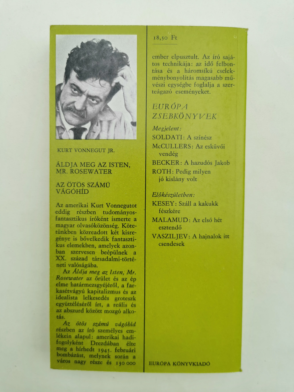 Az amerikai Kurt Vonnegutot eddig részben tudományos-fantasztikus íróként ismerte a magyar olvasóközönség. Kötetünkben közreadott két kisregénye is bővelkedik fantasztikus elemekben, amelyek azonban szervesen beépülnek a XX. század társadalmi-történeti valóságába.