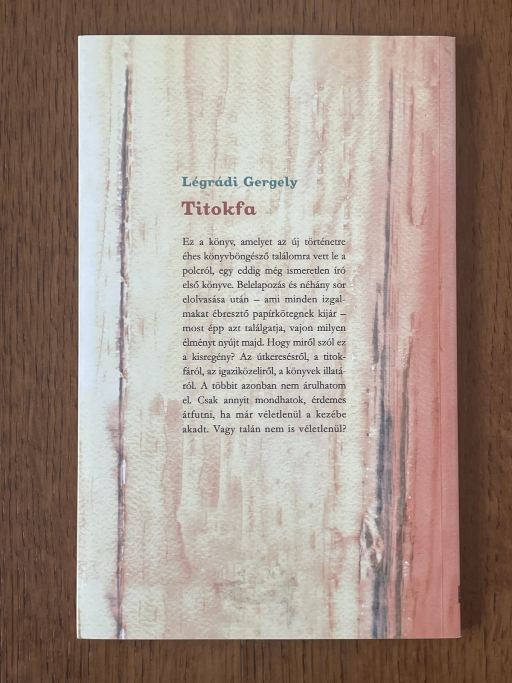 Ez a könyv, amelyet az új történetre éhes könyvböngésző találomra vett le a polcról, egy eddig még ismeretlen író első könyve. Belelapozás és néhány sor elolvasása után – ami minden izgalmakat ébresztő papírkötegnek kijár – most épp azt találgatja, vajon milyen élményt nyújt majd. Hogy miről szól ez a kisregény? Az útkeresésről, a titokfáról, az igaziközeliről, a könyvek illatáról. A többit azonban nem árulhatom el. Csak annyit mondhatok, érdemes átfutni, ha már véletlenül a kezébe akadt. Vagy talán nem is véletlenül?