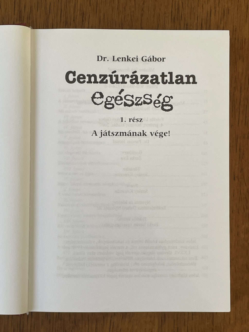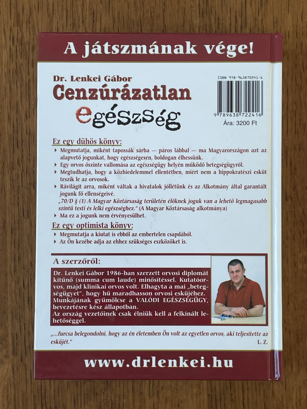 Miként tapossák sárba ma Magyarországon azt az alapvető jogunkat, hogy egészségesen, boldogan élhessünk? Ez egy dühös könyv: Megmutatja, miként tapossák sárba – páros lábbal – ma Magyarországon azt az alapvető jogunkat, hogy egészségesen, boldogan élhessünk. Dr. Lenkei Gábor őszinte vallomása az egészségügy helyén működő betegségügyről. Megtudhatja, hogy a közhiedelemmel ellentétben, miért nem a hippokratészi esküt teszik le az orvosok. Rávilágít arra, miként váltak a hivatalok jóllétünk és az Alkotmány által garantált jogunk fő ellenségeivé.