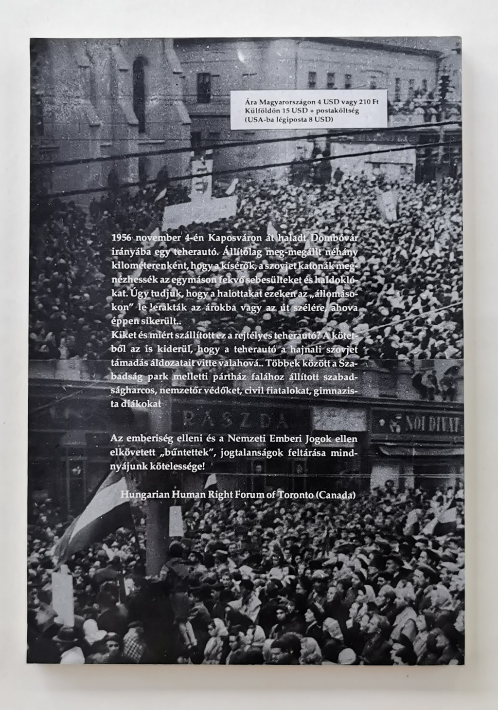 Kiket és miért szállított ez a rejtélyes teherautó? A kötetből az is kiderül hogy a teherautó a hajnali szovjet támadás áldozatait vitte valahová.. Többek között a Szabadság park melletti pártház falához állított szabadságharcos, nemzetőr védőket, civil fiatalokat, gimnazista diákokat.