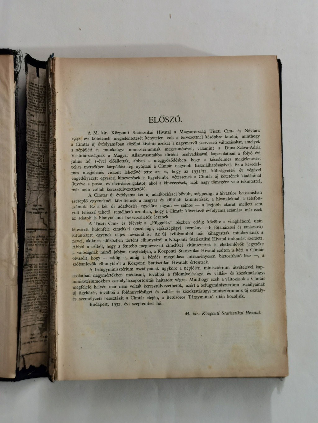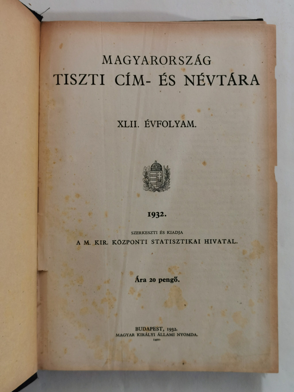Magyarország tiszti cím- és névtára 1932. (XLII. évfolyam) Szerkeszti és kiadja a m. kir. Központi Statisztikai Hivatal. Bp. 1932. M. Királyi Állami Nyomda. XXXVIII, 643 p. Kiadói egészvászon-kötésben.
