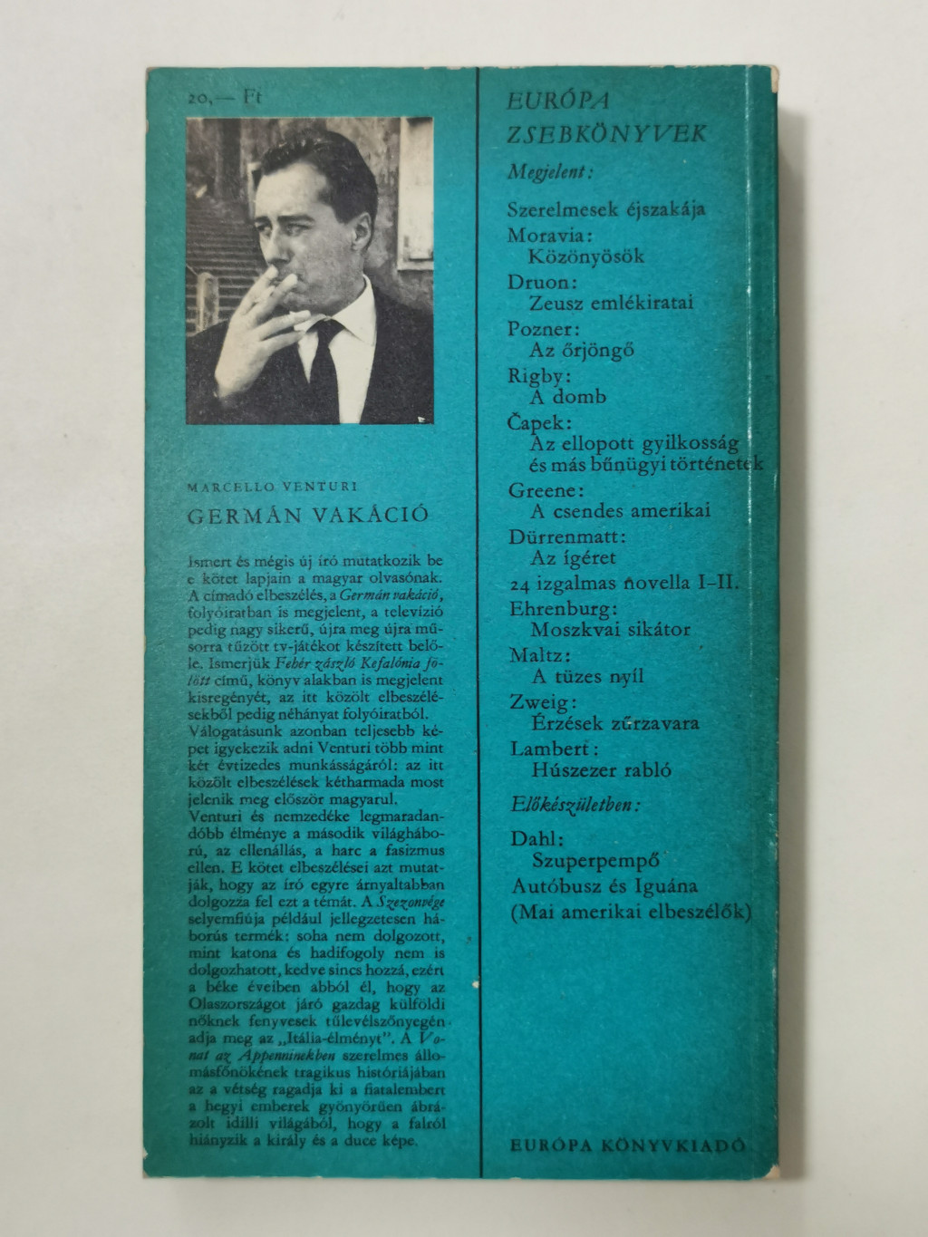 Ismert és mégis új író mutatkozik be e kötet lapjain a magyar olvasónak. A címadó elbeszélés, a Germán vakáció, folyóiratban is megjelent, a televízió pedig nagy sikerű, újra meg újra műsorra tűzött tv-játékot készített belőle. Ismerjük Fehér zászló Kefalónia fölött című, könyv alakban is megjelent kisregényét, az itt közölt elbeszélésekből pedig néhányat folyóiratból. Válogatásunk azonban teljesebb képet igyekszik adni Venturi több mint két évtizedes munkásságáról: az itt közölt elbeszélések kétharmada most jelenik meg először magyarul. Venturi és nemzedéke legmaradandóbb élménye a második világháború, az ellenállás, a harc a fasizmus ellen. E kötet elbeszélései azt mutatják, hogy az író egyre árnyaltabban dolgozza fel ezt a témát. A Szezonvége selyemfiúja például jellegzetesen háborús termék: soha nem dolgozott, mint katona és hadifogoly nem is dolgozhatott, kedve sincs hozzá, ezért a béke éveiben abból él, hogy az Olaszországot járó gazdag külföldi nőknek fenyvesek tűlevélszőnyegén adja meg az „Itális-élményt”. A Vonat az Appenninekben szerelmes állomásfőnökének tragikus históriájában az a vétség ragadja ki a fiatalembert a hegyi emberek gyönyörűen ábrázolt idilli világából, hogy a falról hiányzik a király és duce képe.