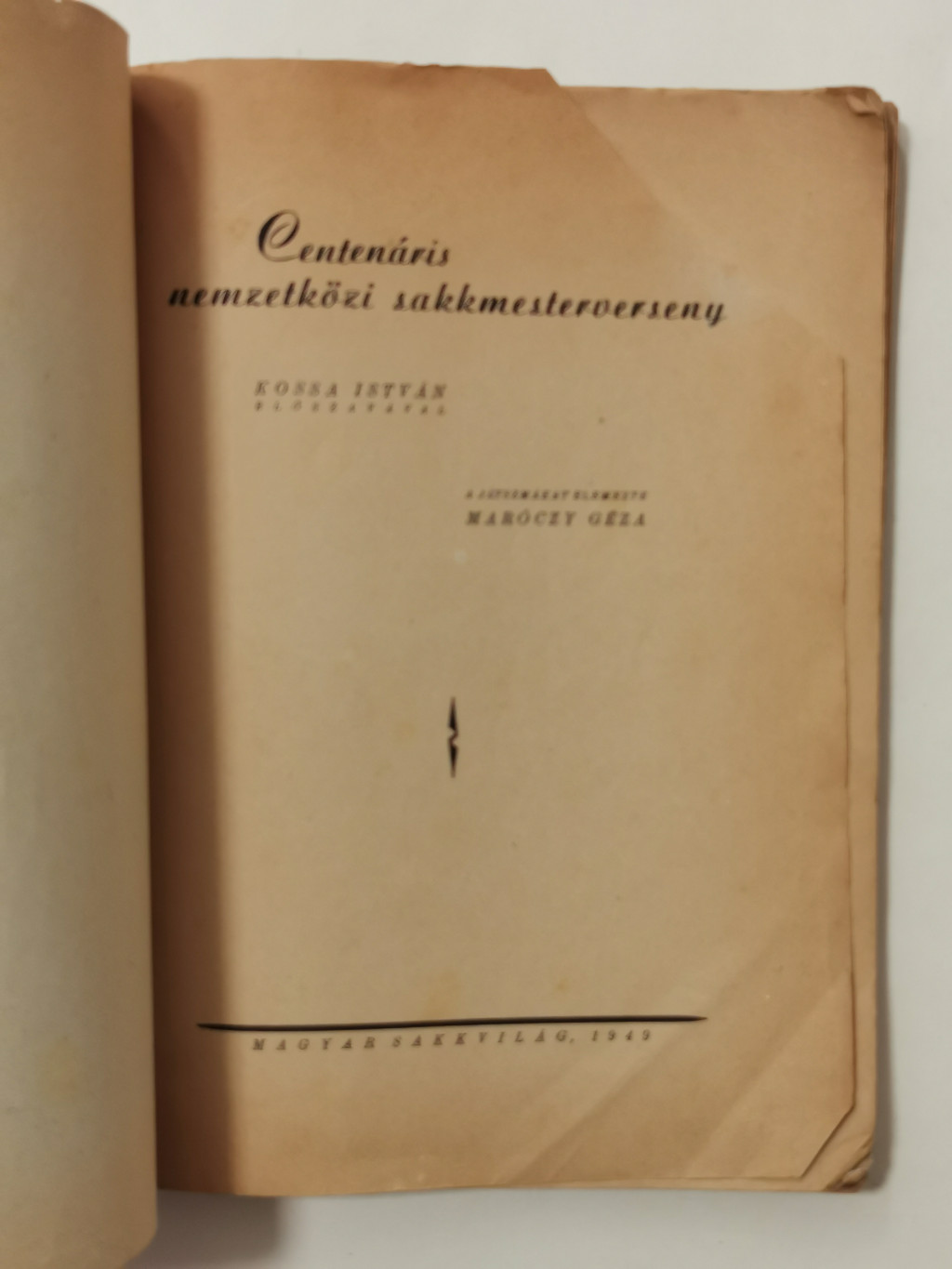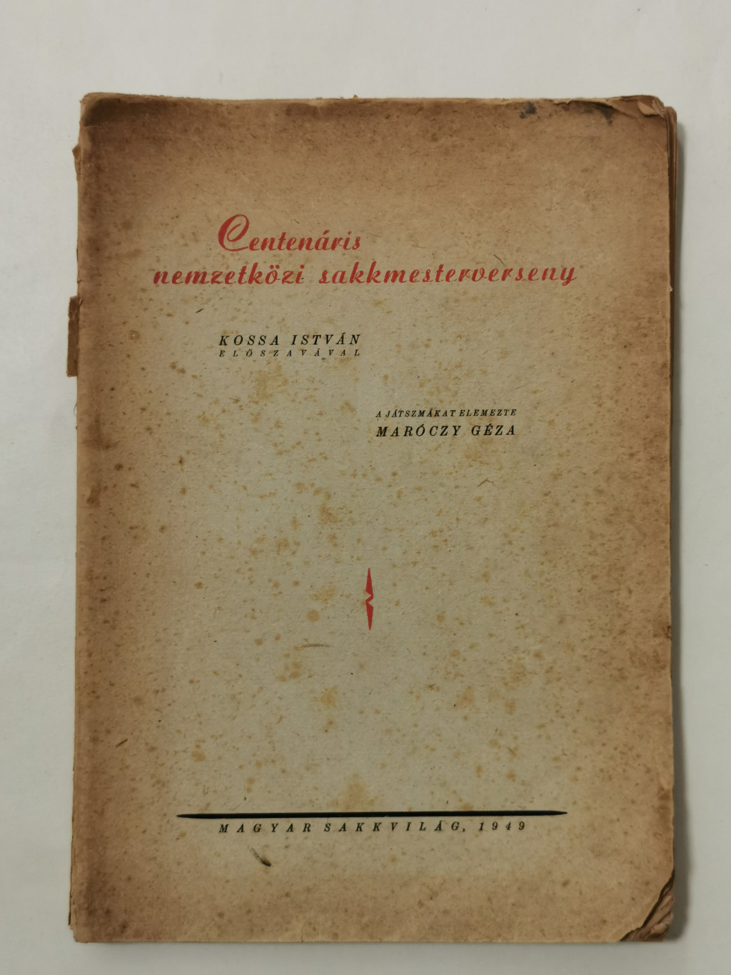 Centenáris nemzetközi sakkmesterverseny. Kossa István előszavával. A játszmákat elemezte Maróczy Géza. [Kecskemét],1949., Magyar Sakkvilág, 15+1 p.+2 t.+17-166+2 p.