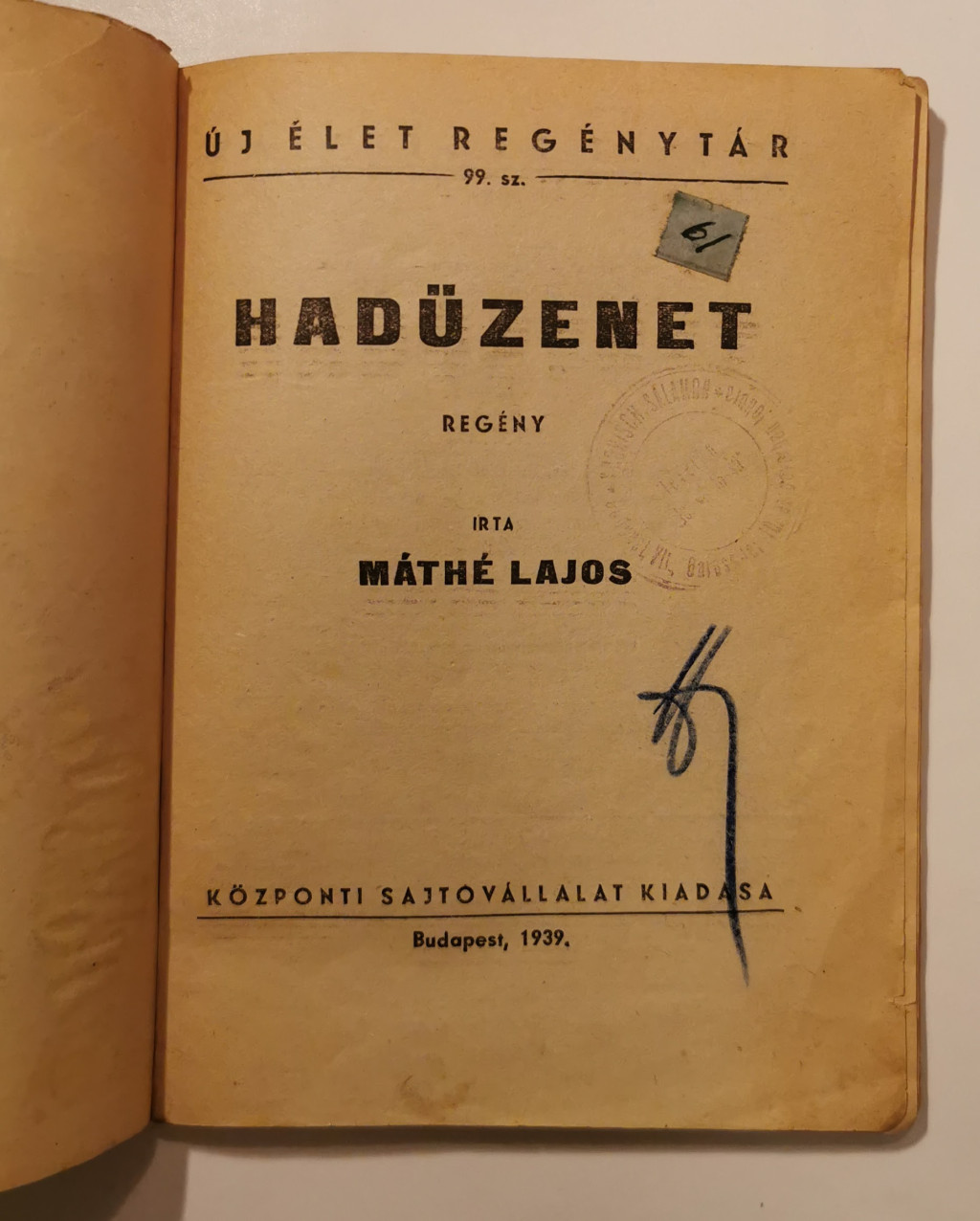 Máthé Lajos: Hadüzenet (Új Élet Regénytár 99.)