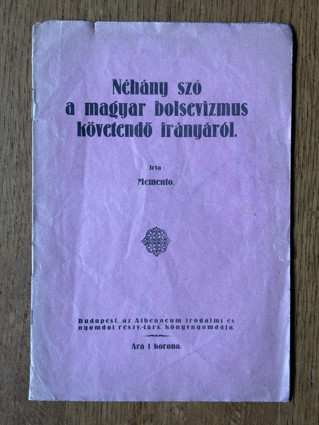 Memento: Néhány szó a magyar bolsevizmus követendő irányáról Bp. (1918.) Athenaeum. 8 p. Kiadói papírborítóban, ritka.