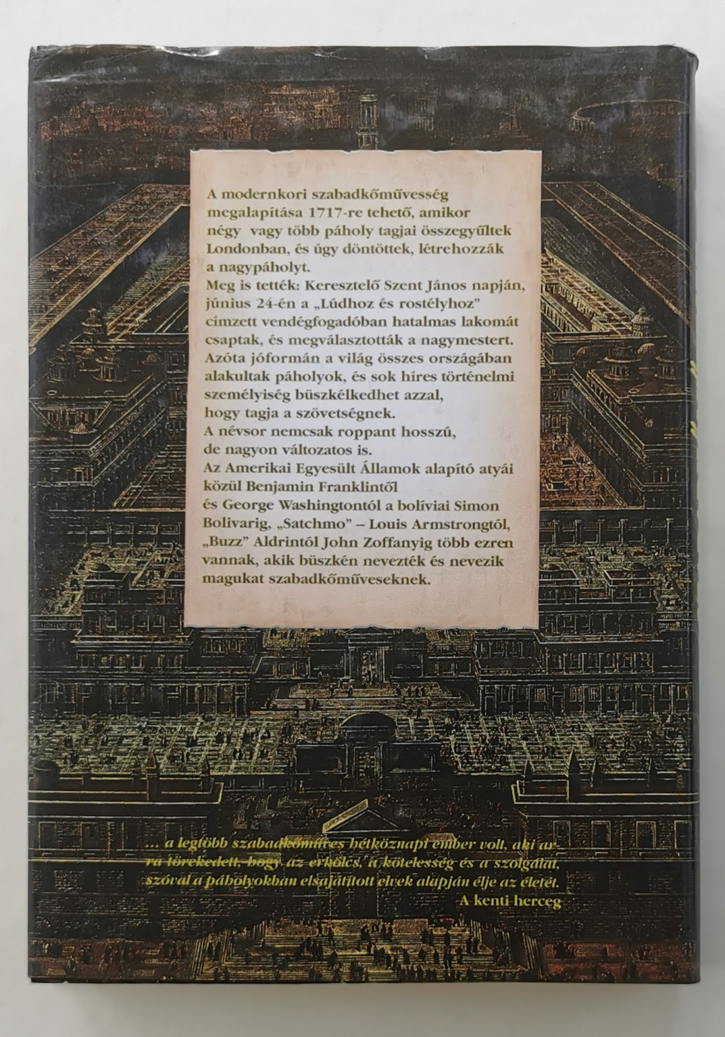 Meg is tették: Keresztelő Szent János napján, június 24-én a „Lúdhoz és rostélyhoz” címzett vendégfogadóban hatalmas lakomát csaptak, és megválasztották a nagymestert. Azóta jóformán a világ összes országában alakultak páholyok, és sok híres történelmi személyiség büszkélkedhet azzal, hogy tagja a szövetségnek.