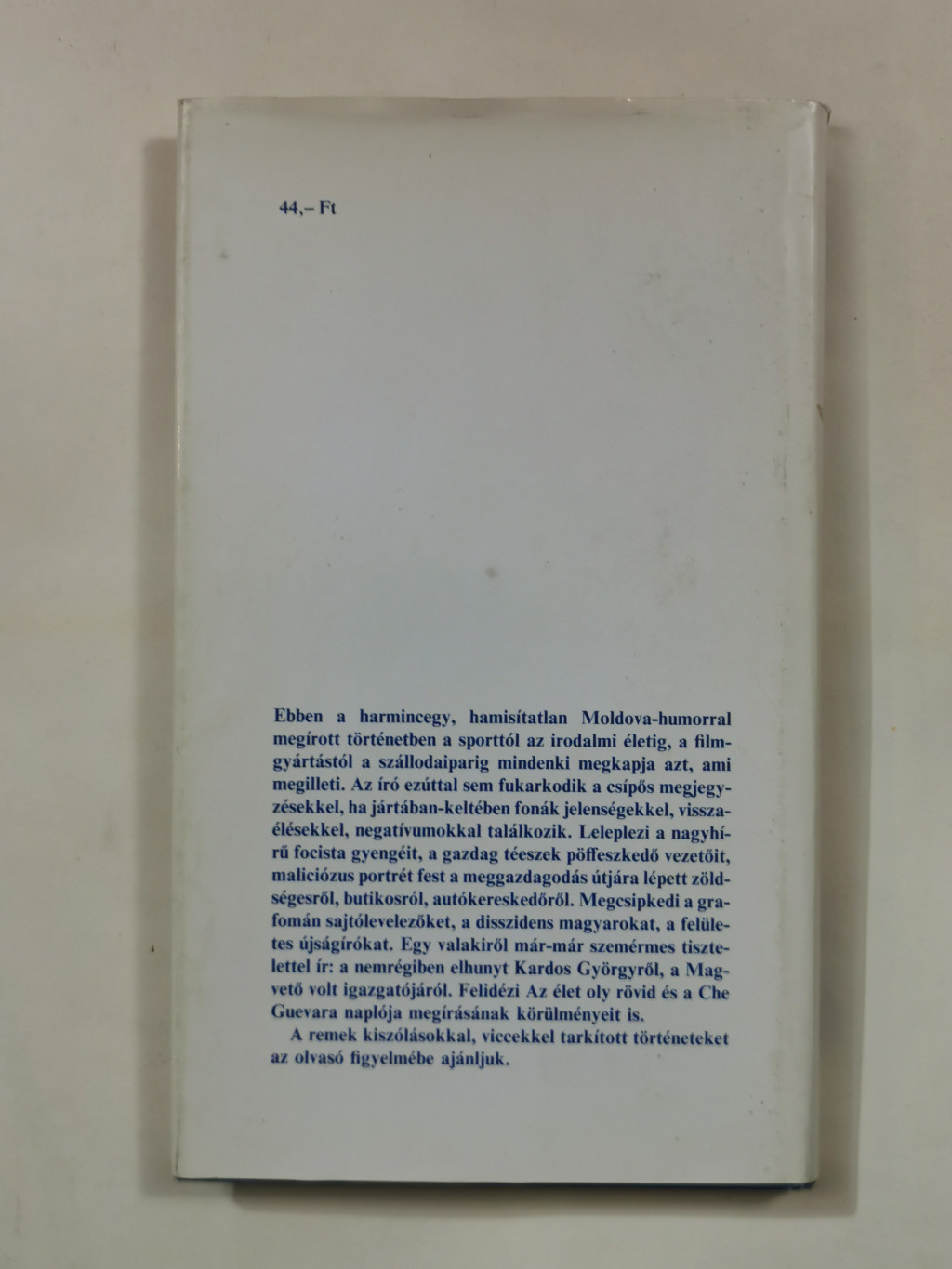 Ebben a harmincegy, hamisítatlan Moldova-humorral megírott történetben a sporttól az irodalmi életig, a filmgyártástól a szállodaiparig mindenki megkapja azt, ami megilleti. Az író ezúttal sem fukarkodik a csípős megjegyzésekkel, ha jártában-keltében fonák jelenségekkel, visszaélésekkel, negatívumokkal találkozik. Leleplezi a nagyhírű focista gyengéit, a gazdag téeszek pöffeszkedő vezetőit, maliciózus portrét fest a meggazdagodás útjára lépett zöldségesről, butikosról, autókereskedőről. Megcsipkedi a grafomán sajtólevelezőket, a disszidens magyarokat, a felületes újságírókat. Egy valakiről már-már szemérmes tisztelettel ír: a nemrégiben elhunyt Kardos Györgyről, a Magvető volt igazgatójáról. Felidézi Az élet oly rövid és a Che Guevara naplója megírásának körülményeit is.