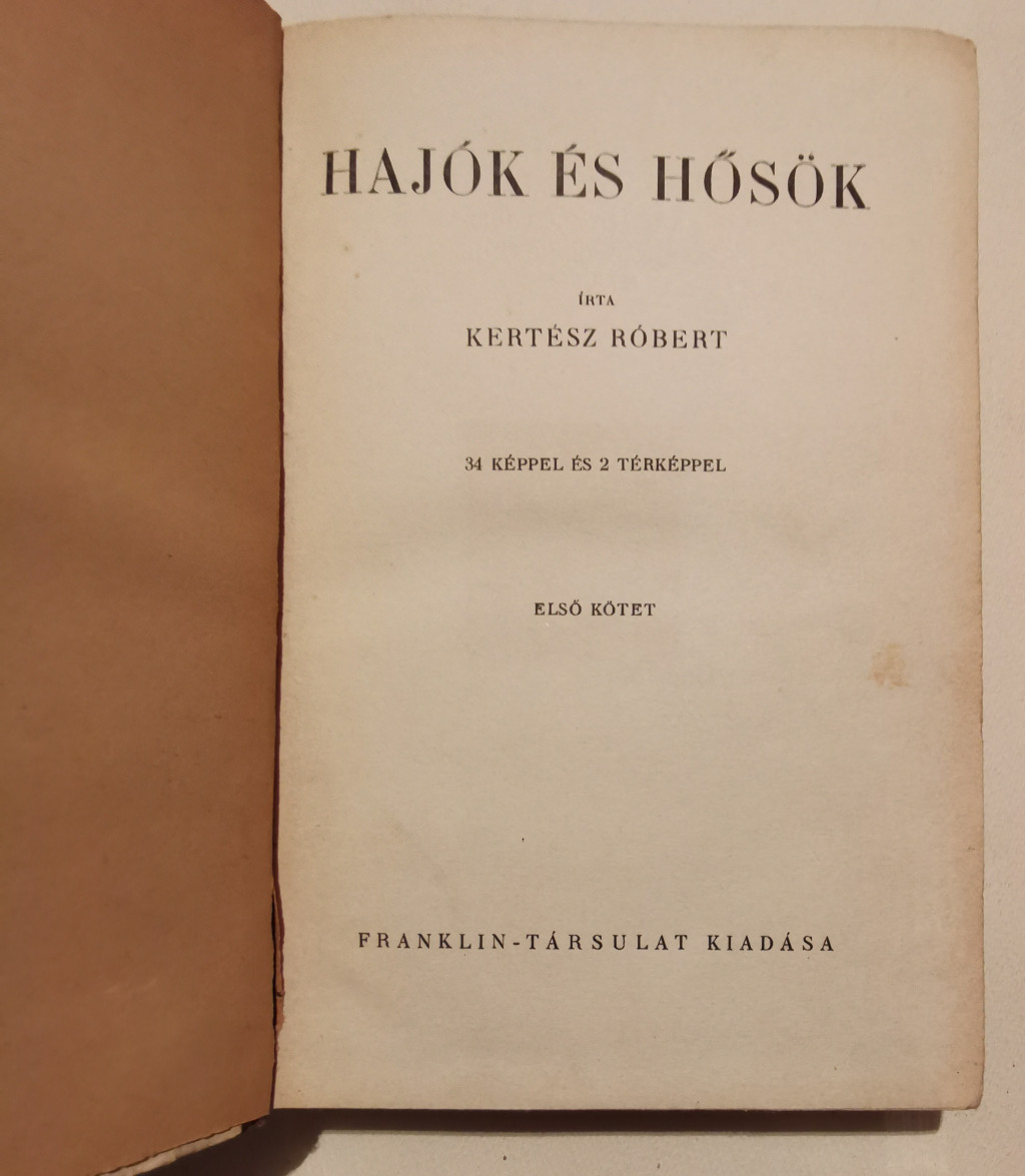 Kertész Róbert: Hajók és hősök. I-II. köt. [Egy kötetben]. Bp., [1943], Franklin-Társulat, 155+(1) p.+ 12 t.; 133+(3) p.+ 12 t. Az előzékeken térképekkel, szövegközti táblázatokkal és lapszámozáson kívüli egészoldalas képtáblákkal illusztrált. Kiadói, aranyozott gerincű  félvászon kötésben, kissé kopott gerinccel, stabil tartásban.