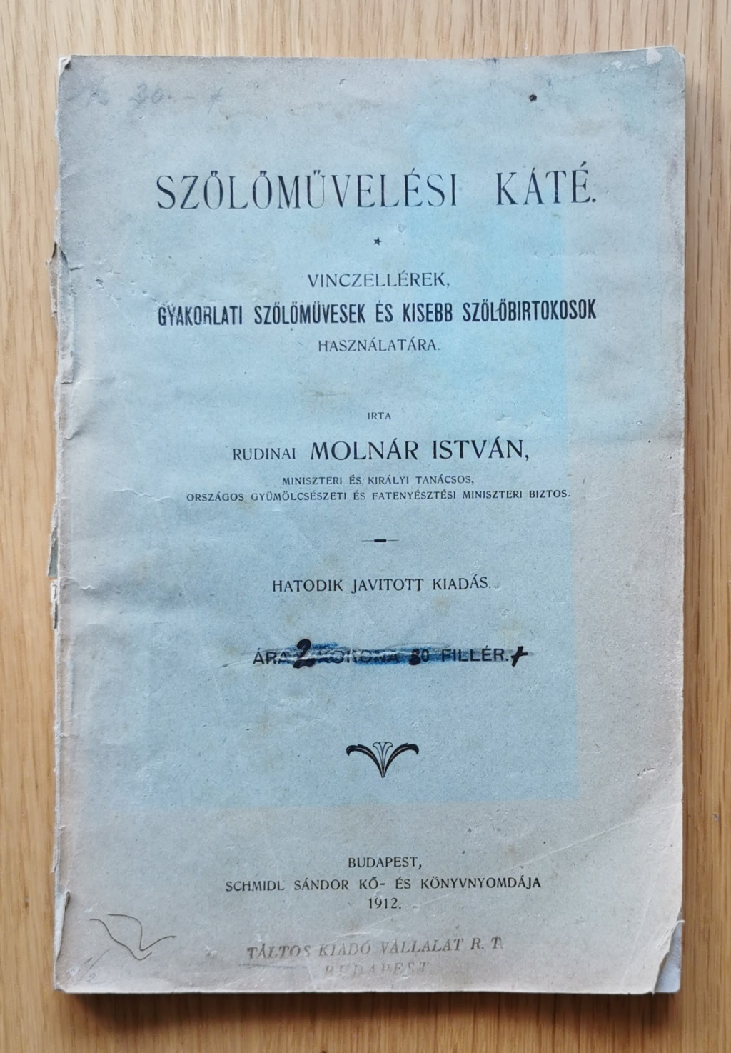 Molnár István: Szőlőművelési káté. Vinczellérek, gyakorlati szőlőművesek és kisebb szőlőbirtokosok használatára. 6. jav. kiad. Bp. 1912. Schmdil. 93 p. A hátsó borító lejár. Fűzve, kiadói borítékban.