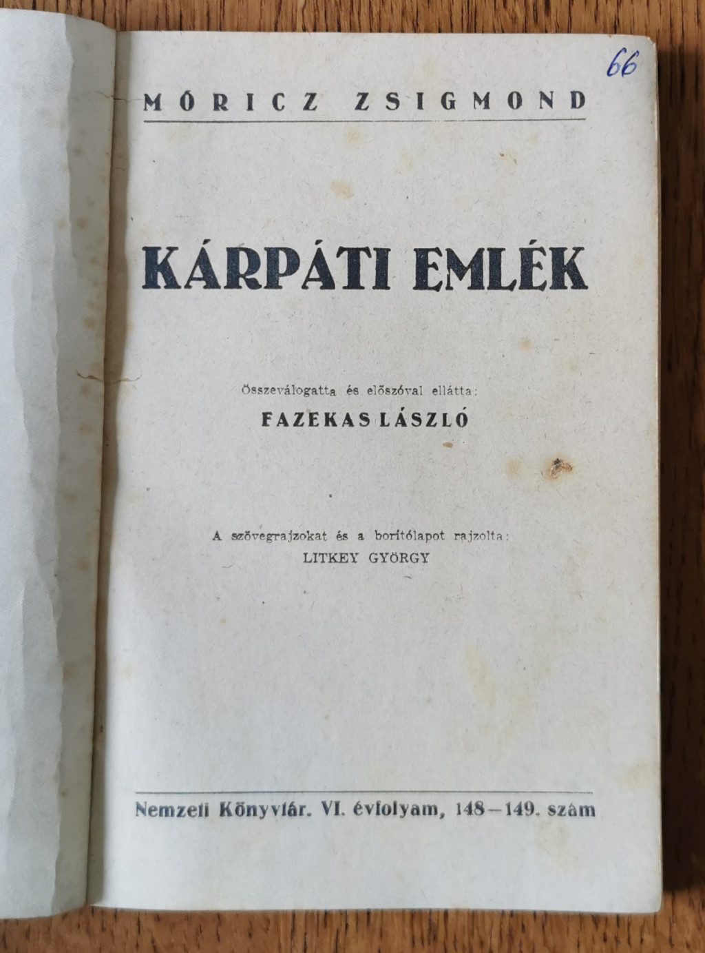 Móricz Zsigmond: Kárpáti emlék. Összeválogatta és előszó Fazekas László. (Bp. 1944, Stádium). 128 p. Számos szövegközti rajzzal illusztrálva, melyeket Litkey György készített. /Nemzeti Könyvtár 148-149./ Kiadói, színes, illusztrált papírborítóban.