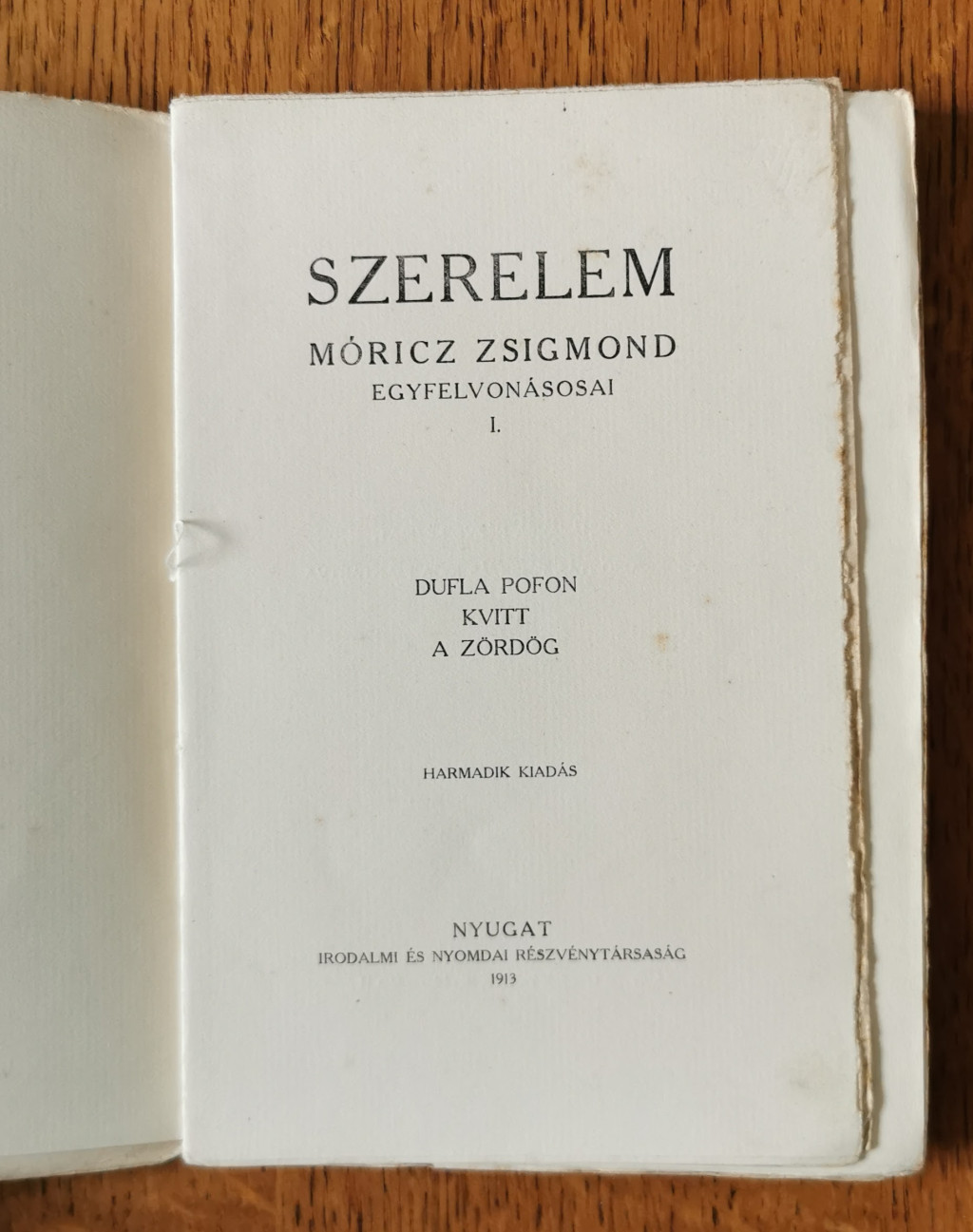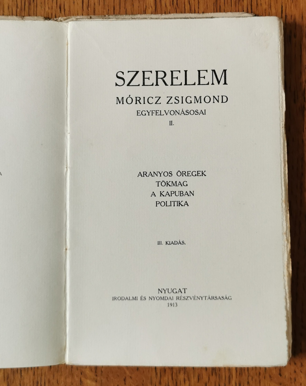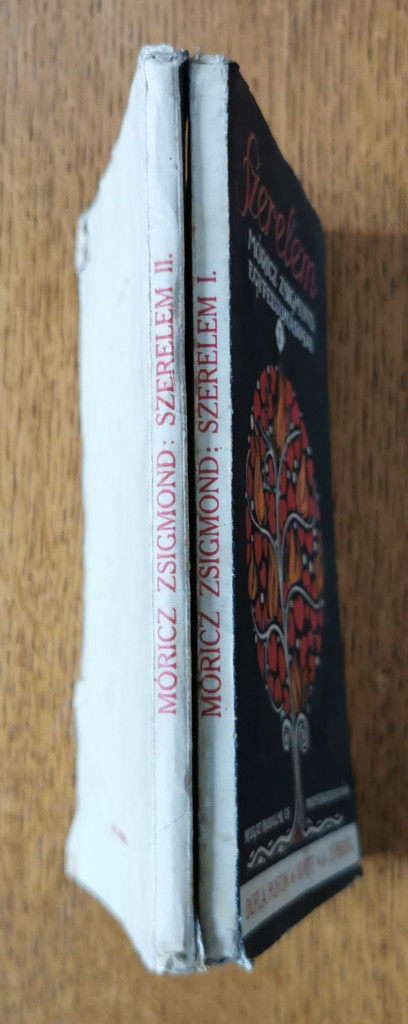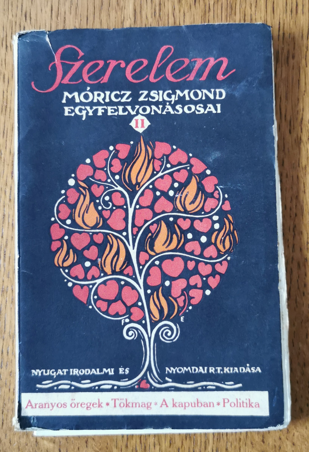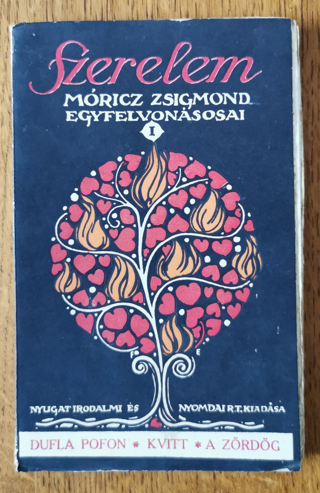 Móricz Zsigmond: Szerelem I-II. köt. Móricz Zsigmond egyfelvonásosai. I. köt.: Dupla pofon. Kvitt. A zördög. II. köt.: Aranyos öregek. Tökmag. A kapuban. Politika. Bp., 1913. Nyugat, 79;78+1 p. Első kiadás! A borító Falus Elek munkája.