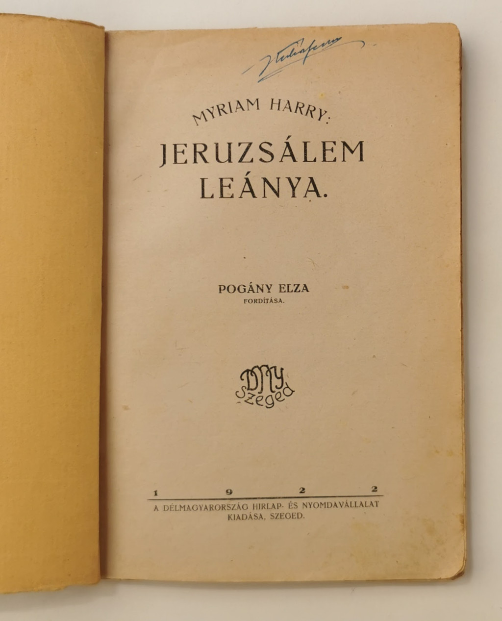 Myriam Harry: Jeruzsálem leánya. Pogány Elza fordítása. Szeged, 1922. Délmagyarország Hírlap- és Nyomdavállalat. 170+(2) p.