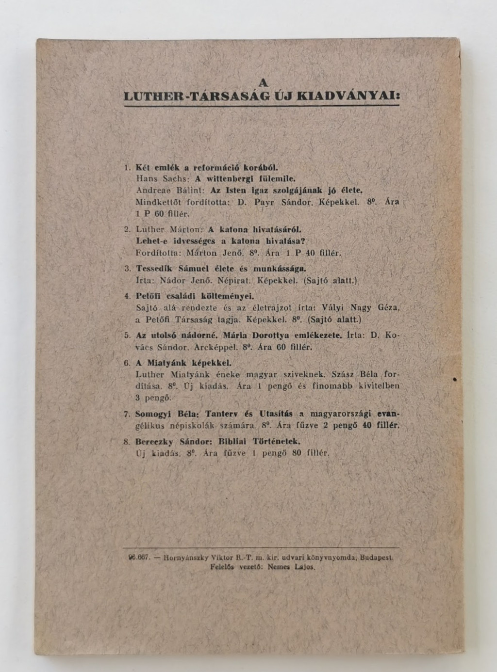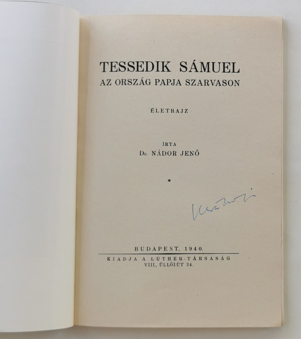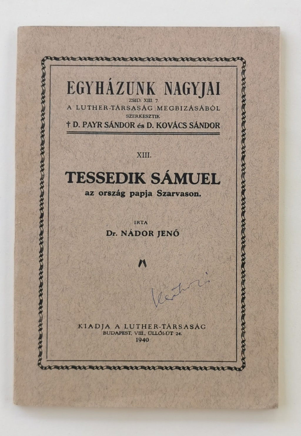 Nádor Jenő, Dr.: Tessedik Sámuel - az ország papja Szarvason Budapest, 1940. Luther Társaság (Hornyánszky Viktor ny.). 1 t. (címkép), 80 p. /Egyházunk Nagyjai./ Fűzött, kiadói papírborítékban,