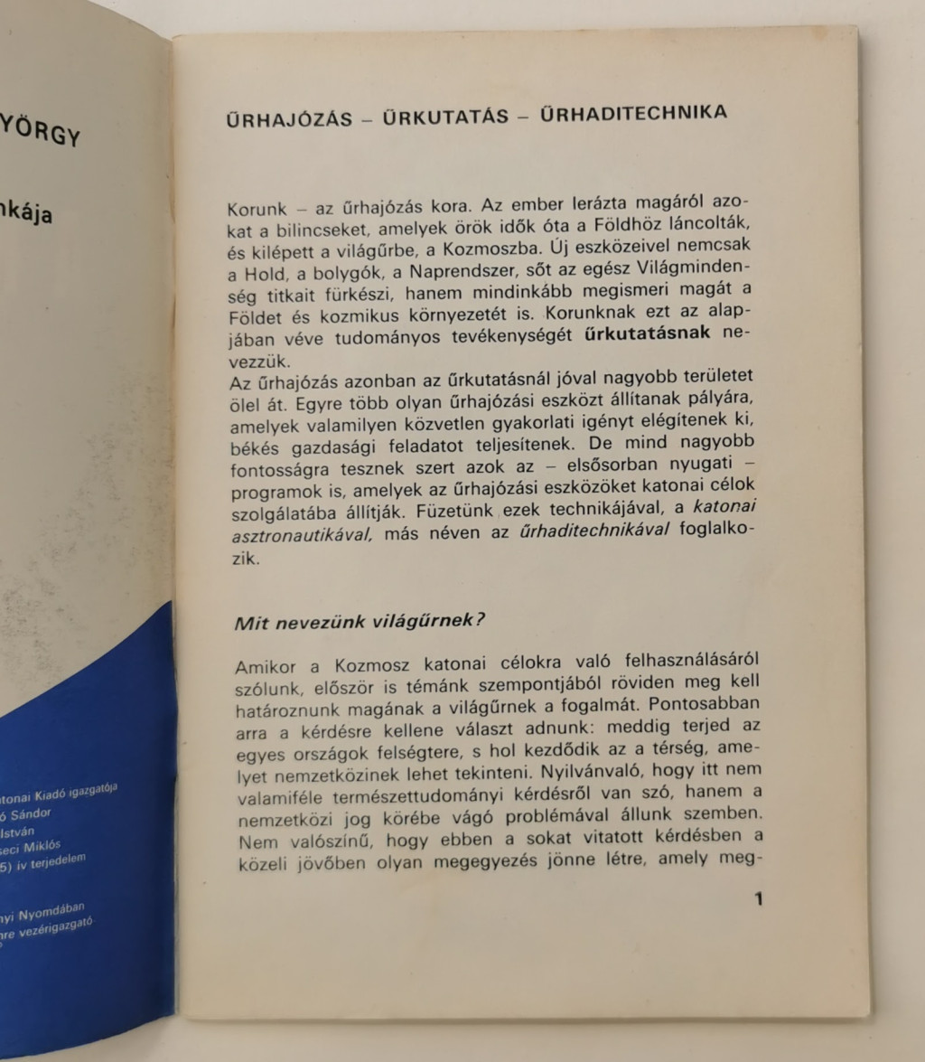 Az űrhajózás azonban az űrkutatásnál jóval nagyobb területet ölel át. Egyre több olyan űrhajózási eszközt állítanak pályára, amelyek valamilyen közvetlen gyakorlati igényt elégítenek ki, békés gazdasági feladatot teljesítenek. De mind nagyobb fontosságra tesznek szert azok az – elsősorban nyugati – programok is, amelyek az űrhajózási eszközöket katonai célok szolgálatába állítják. Füzetünk ezek technikájával, a katonai asztronautikával, más néven az űrhaditechnikával foglalkozik.