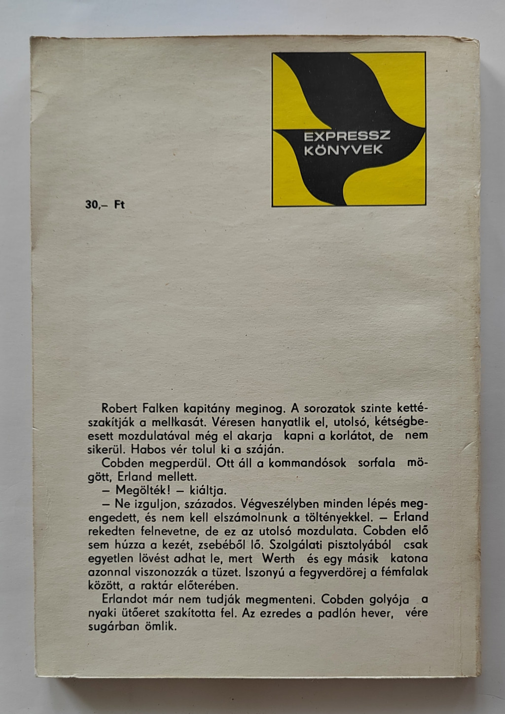 – Ne izguljon, százados. Végveszélyben minden lépés megengedett, és nem kell elszámolnunk a töltényekkel. – Erland rekedten felnevetne, de ez az utolsó mozdulata. Cobden elő sem húzza a kezét, zsebéből lő. Szolgálati pisztolyából csak egyetlen lövést adhat le, mert Werth és egy másik katona azonnal viszonozzák a tüzet. Iszonyú a fegyverdörej a fémfalak között, a raktár előterében.
